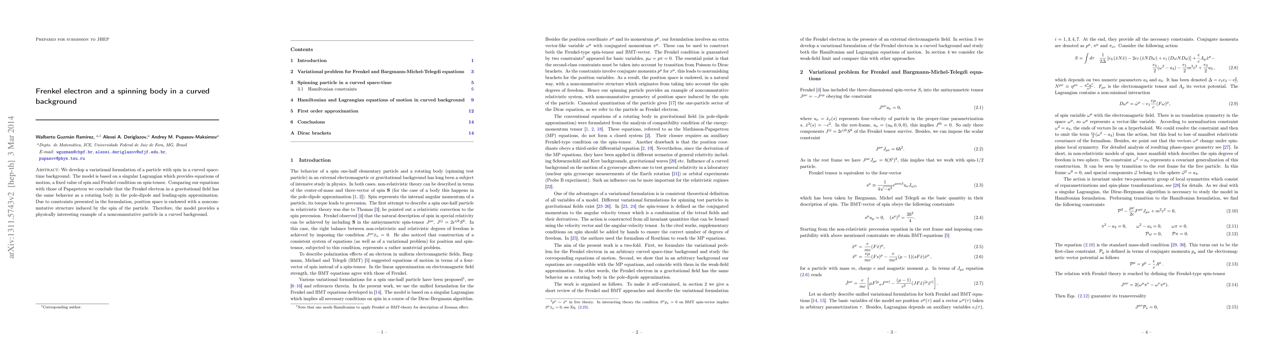 We develop a variational formulation of a particle with spin in a curved space-time background. The model is based on a singular Lagrangian which provides equations of motion, a fixed value of spin and Frenkel condition on spin-tensor. Comparing our equations with those of Papapetrou we conclude that the Frenkel electron in a gravitational field has the same behavior as a rotating body in the pole-dipole and leading-spin approximation. Due to constraints presented in the formulation, position space is endowed with a noncommutative structure induced by the spin of the particle. Therefore, the model provides a physically interesting example of a noncommutative particle in a curved background.