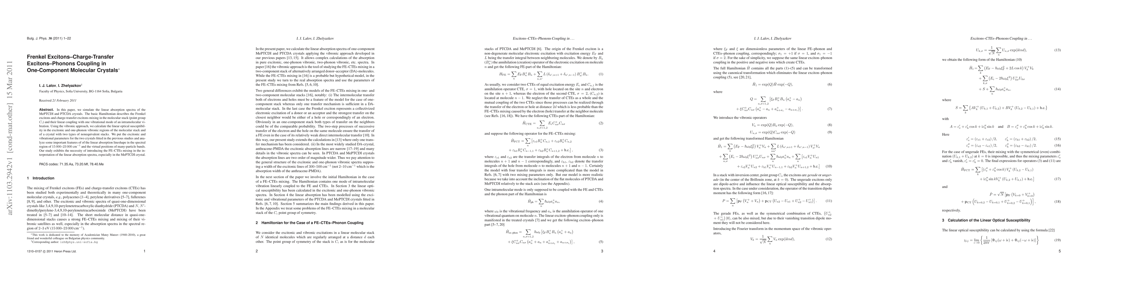 This paper simulates the linear absorption spectra of MePTCDI and PTCDA crystals, focusing on the coupling between Frenkel and charge-transfer excitons and a single phonon mode. It highlights the importance of considering the mixing of these excitons in interpreting the spectral features, particularly in the MePTCDI crystal.