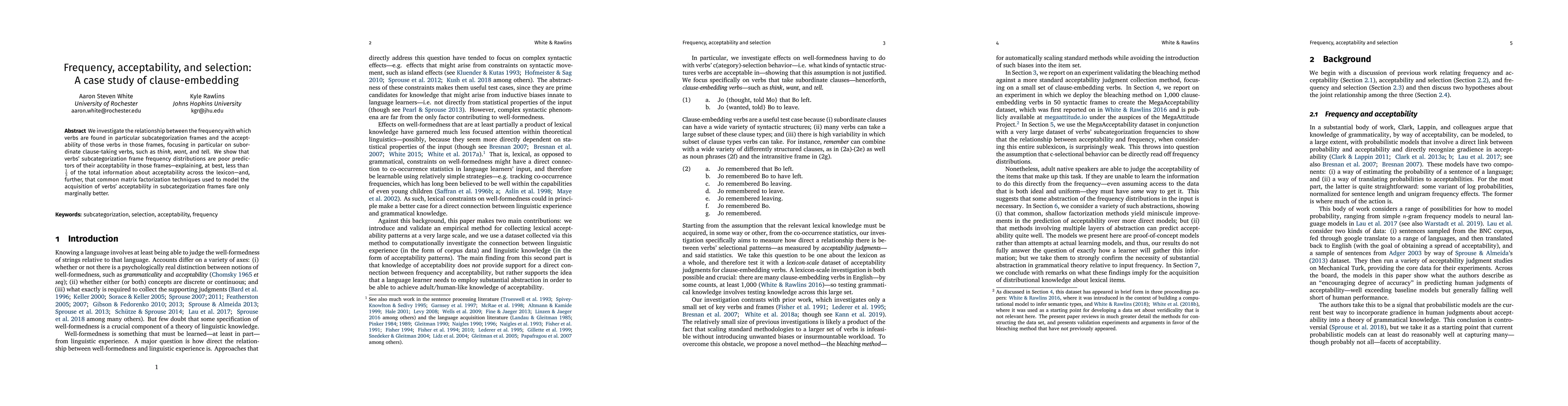 We investigate the relationship between the frequency with which verbs are found in particular subcategorization frames and the acceptability of those verbs in those frames, focusing in particular on subordinate clause-taking verbs, such as "think", "want", and "tell". We show that verbs' subcategorization frame frequency distributions are poor predictors of their acceptability in those frames---explaining, at best, less than 1/3 of the total information about acceptability across the lexicon---and, further, that common matrix factorization techniques used to model the acquisition of verbs' acceptability in subcategorization frames fare only marginally better. All data and code are available at http://megaattitude.io.
