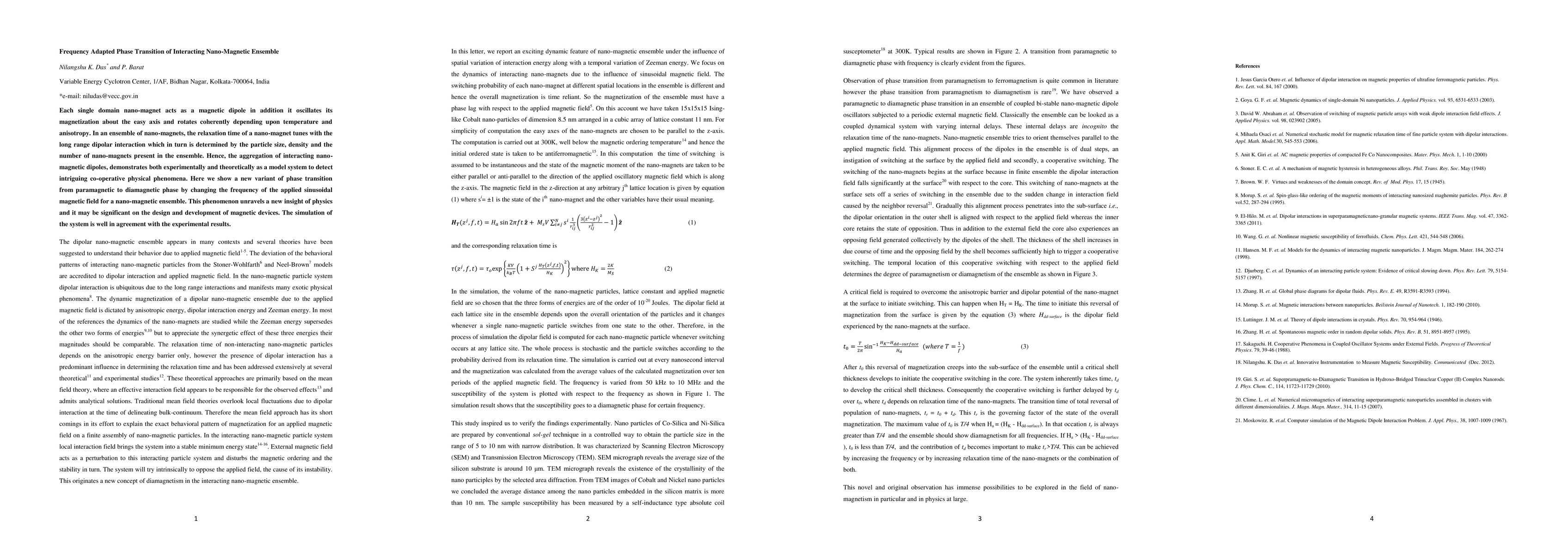 Each single domain nano-magnet acts as a magnetic dipole in addition it oscillates its magnetization about the easy axis and rotates coherently depending upon temperature and anisotropy. In an ensemble of nano-magnets, the relaxation time of a nano-magnet tunes with the long range dipolar interaction which in turn is determined by the particle size, density and the number of nano-magnets present in the ensemble. Hence, the aggregation of interacting nano-magnetic dipoles, demonstrates both experimentally and theoretically as a model system to detect intriguing co-operative physical phenomena. Here we show a new variant of phase transition from paramagnetic to diamagnetic phase by changing the frequency of the applied sinusoidal magnetic field for a nano-magnetic ensemble. This phenomenon unravels a new insight of physics and it may be significant on the design and development of magnetic devices. The simulation of the system is well in agreement with the experimental results.