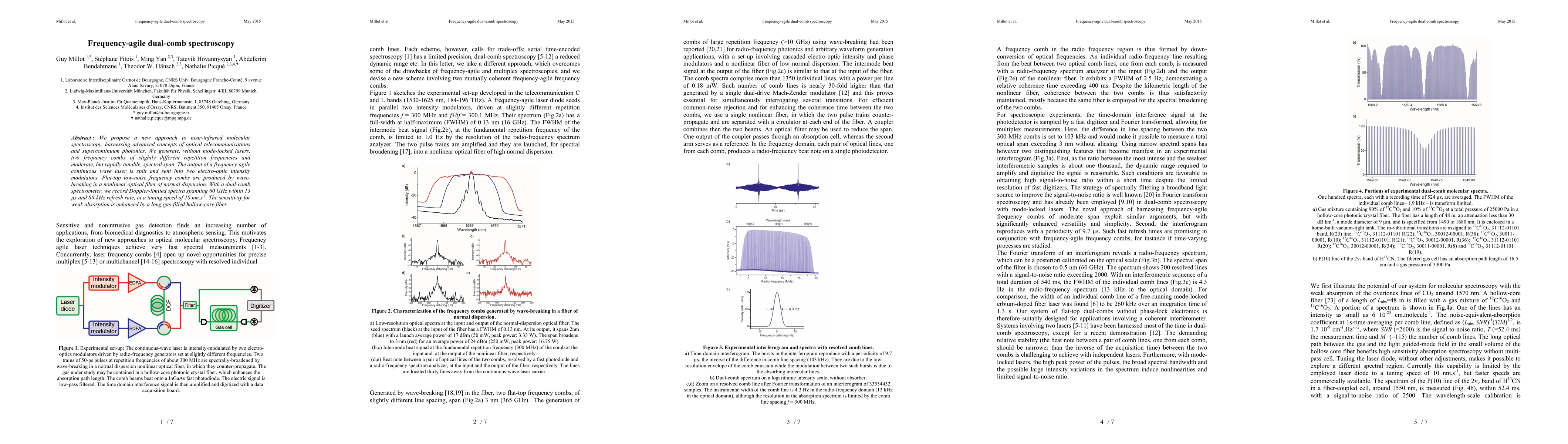 We propose a new approach to near-infrared molecular spectroscopy, harnessing advanced concepts of optical telecommunications and supercontinuum photonics. We generate, without mode-locked lasers, two frequency combs of slightly different repetition frequencies and moderate, but rapidly tunable, spectral span. The output of a frequency-agile continuous wave laser is split and sent into two electro-optic intensity modulators. Flat-top low-noise frequency combs are produced by wave-breaking in a nonlinear optical fiber of normal dispersion. With a dual-comb spectrometer, we record Doppler-limited spectra spanning 60 GHz within 13 microseconds and 80-kHz refresh rate, at a tuning speed of 10 nm.s^(-1). The sensitivity for weak absorption is enhanced by a long gas-filled hollow-core fiber.