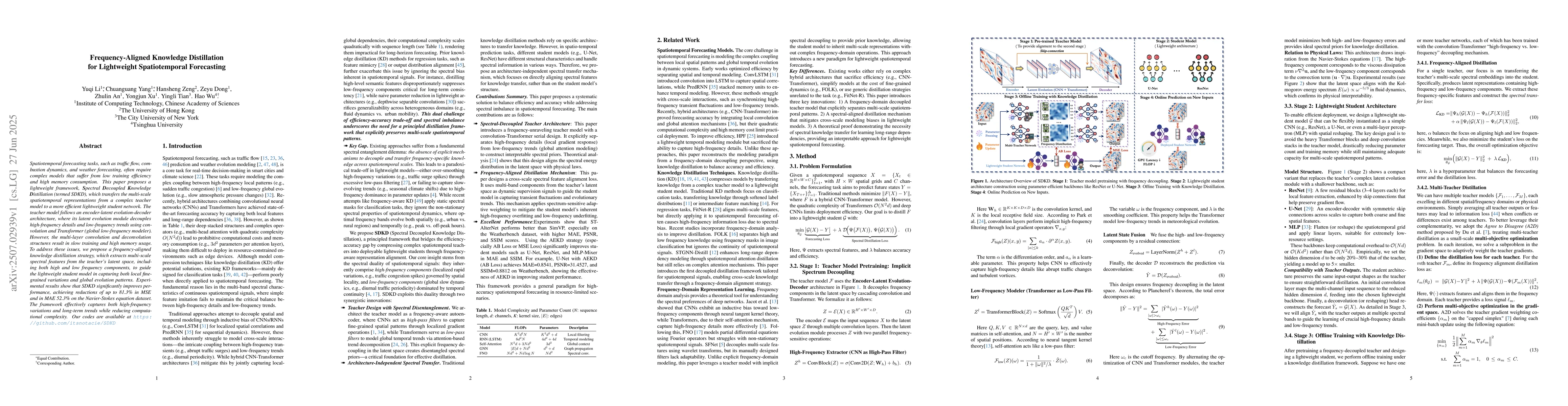 Spatiotemporal forecasting tasks, such as traffic flow, combustion dynamics, and weather forecasting, often require complex models that suffer from low training efficiency and high memory consumption. This paper proposes a lightweight framework, Spectral Decoupled Knowledge Distillation (termed SDKD), which transfers the multi-scale spatiotemporal representations from a complex teacher model to a more efficient lightweight student network. The teacher model follows an encoder-latent evolution-decoder architecture, where its latent evolution module decouples high-frequency details and low-frequency trends using convolution and Transformer (global low-frequency modeler). However, the multi-layer convolution and deconvolution structures result in slow training and high memory usage. To address these issues, we propose a frequency-aligned knowledge distillation strategy, which extracts multi-scale spectral features from the teacher's latent space, including both high and low frequency components, to guide the lightweight student model in capturing both local fine-grained variations and global evolution patterns. Experimental results show that SDKD significantly improves performance, achieving reductions of up to 81.3% in MSE and in MAE 52.3% on the Navier-Stokes equation dataset. The framework effectively captures both high-frequency variations and long-term trends while reducing computational complexity. Our codes are available at https://github.com/itsnotacie/SDKD