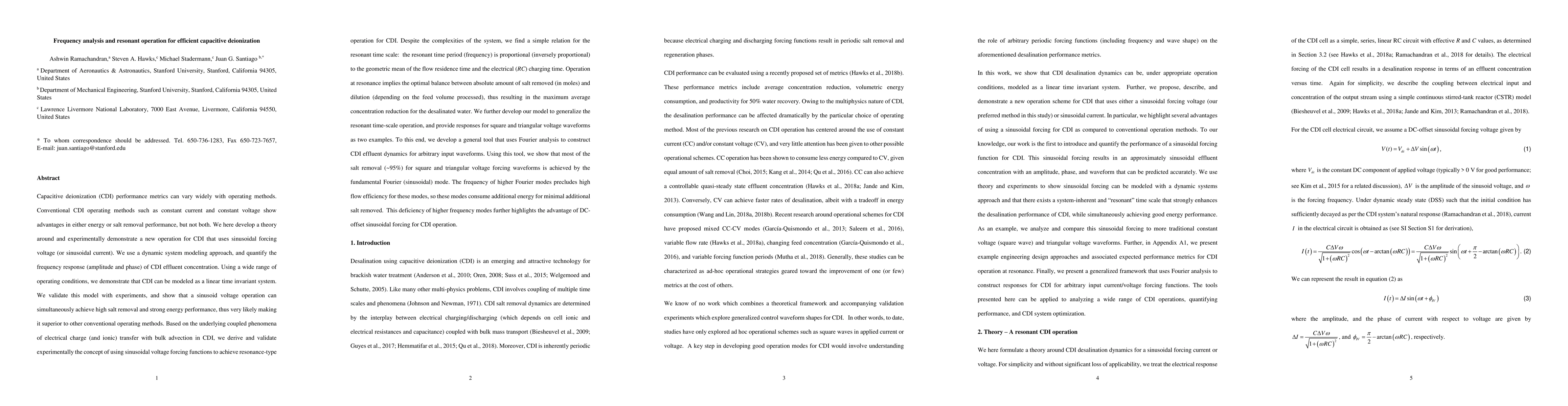 The research introduces a novel sinusoidal voltage operation for capacitive deionization (CDI), demonstrating high salt removal and energy efficiency. It models CDI as a linear time-invariant system, validating it experimentally and finding resonant time scale proportional to flow and electrical charging times. The study shows most salt removal occurs via the fundamental sinusoidal mode, highlighting the advantage of DC-offset sinusoidal forcing for CDI.