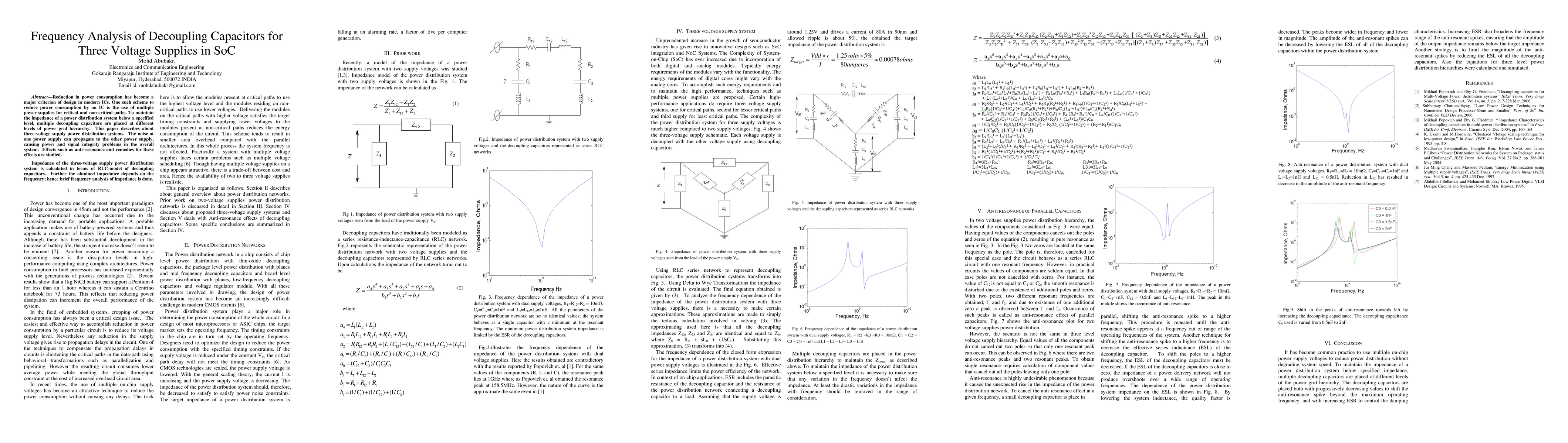 A three-voltage supply power distribution system is analyzed using RLC-model of decoupling capacitors.