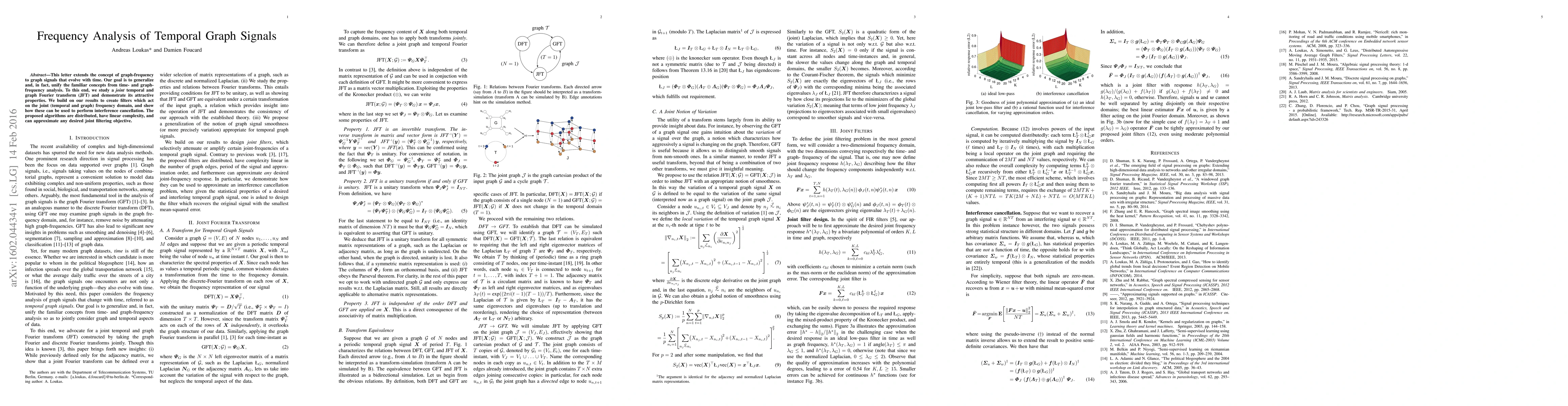 This letter extends the concept of graph-frequency to graph signals that evolve with time. Our goal is to generalize and, in fact, unify the familiar concepts from time- and graph-frequency analysis. To this end, we study a joint temporal and graph Fourier transform (JFT) and demonstrate its attractive properties. We build on our results to create filters which act on the joint (temporal and graph) frequency domain, and show how these can be used to perform interference cancellation. The proposed algorithms are distributed, have linear complexity, and can approximate any desired joint filtering objective.