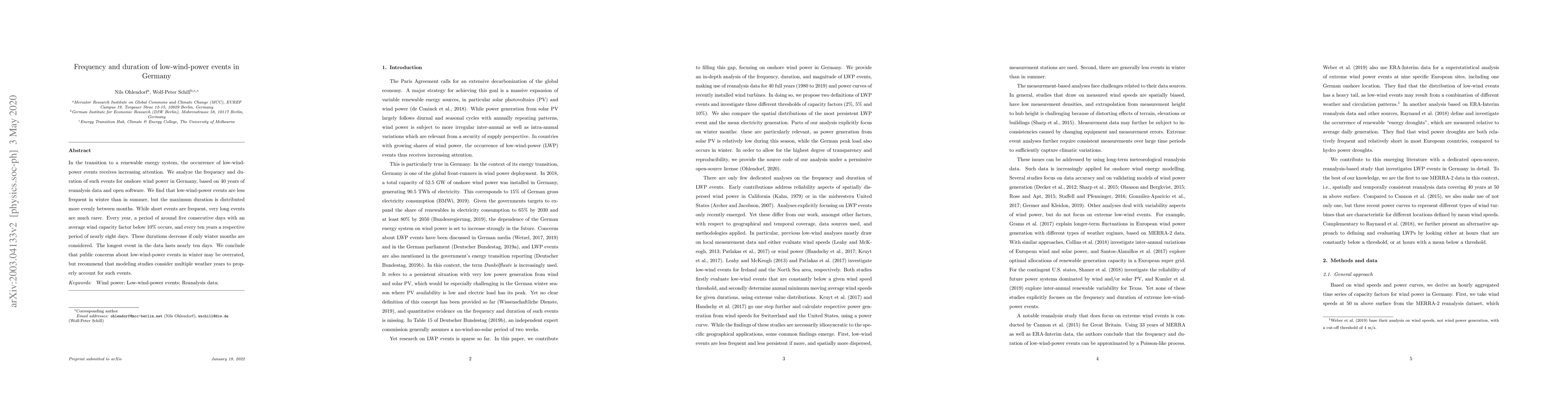 Low-wind-power events in Germany occur less frequently in winter but with similar maximum durations, contradicting public concerns. Longest event was nearly 10 days long, emphasizing the need for multiple weather years to model such events accurately.