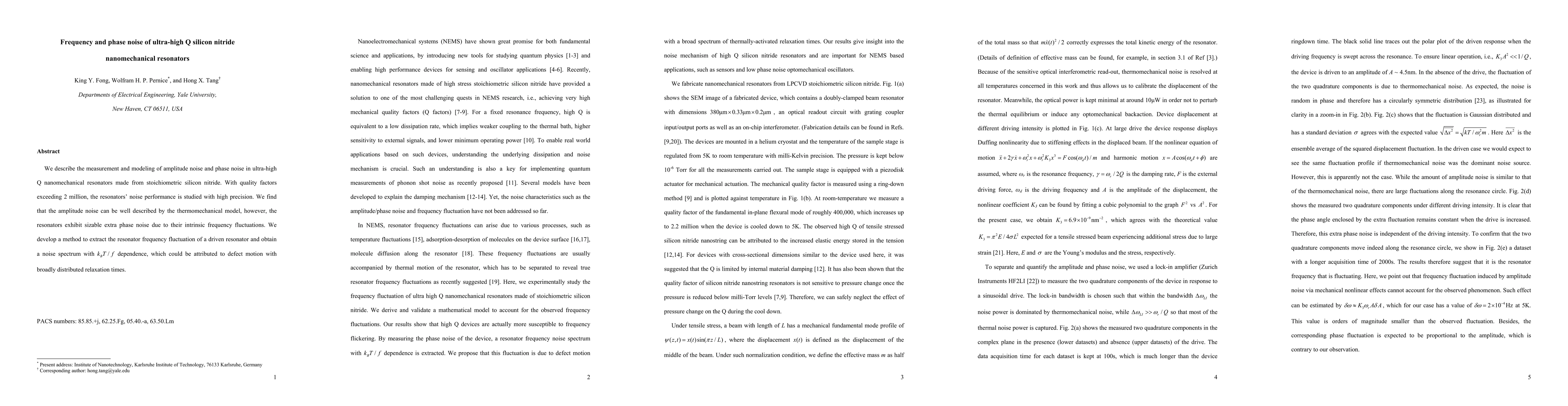 This study measures and models noise in ultra-high Q silicon nitride nanomechanical resonators, finding that while amplitude noise aligns with thermomechanical models, significant intrinsic phase noise arises from frequency fluctuations. The developed method reveals a noise spectrum dependent on defect motion with varied relaxation times.