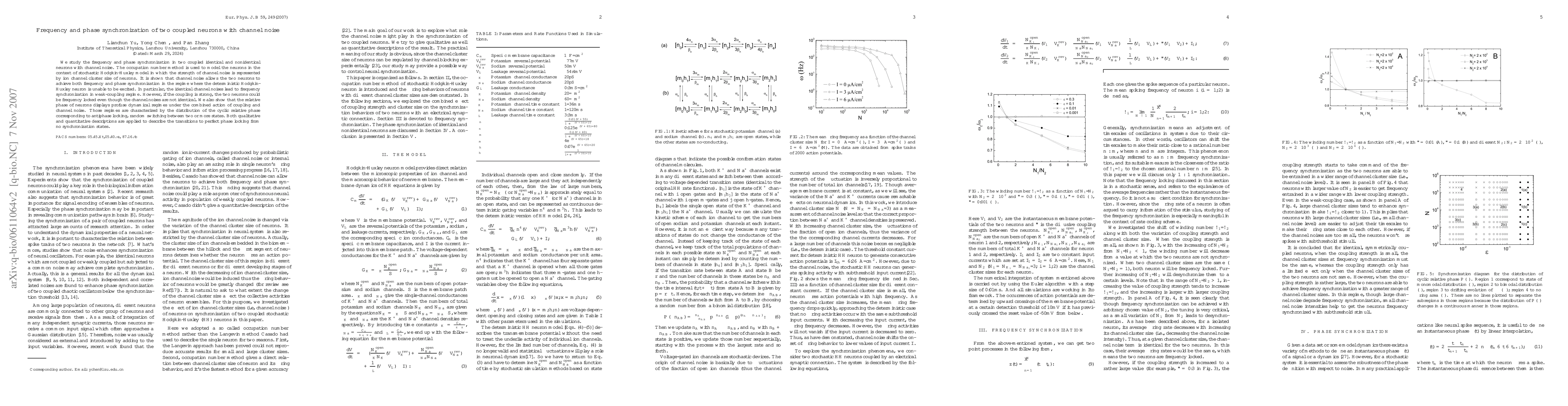 This paper investigates frequency and phase synchronization in coupled neurons with channel noise, using the occupation number method within the stochastic Hodgkin-Huxley model. It finds that identical channel cluster sizes enable frequency synchronization regardless of coupling strength, while the relative phase exhibits complex dynamics influenced by coupling and noise.
