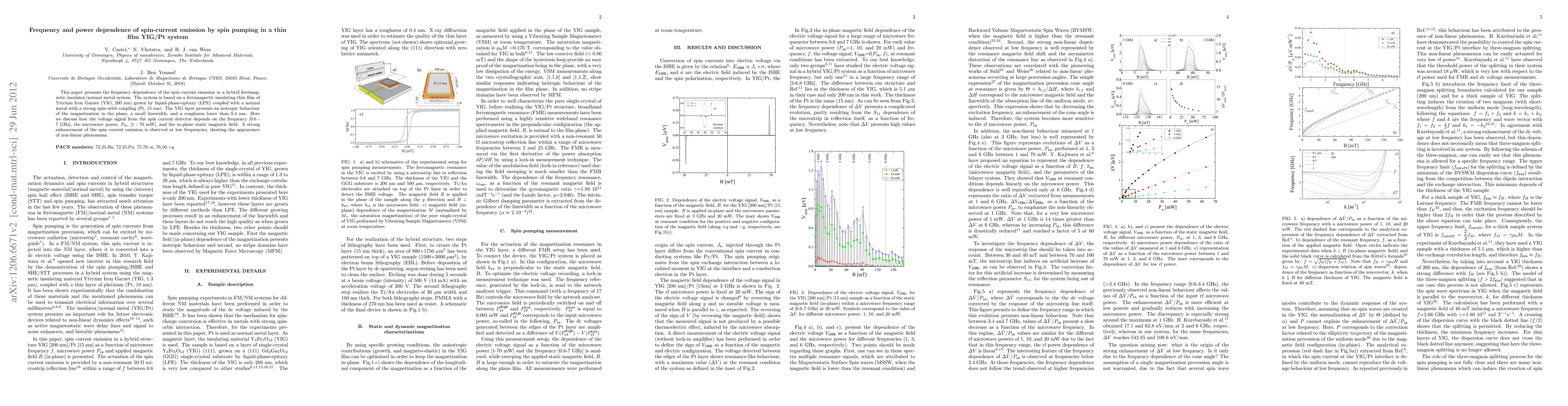 This paper investigates the frequency and power dependence of spin current emission in a YIG/Pt thin film system, revealing significant enhancement at low frequencies and non-linear phenomena. The study highlights the impact of microwave power and static magnetic field on the voltage signal from the spin current detector.