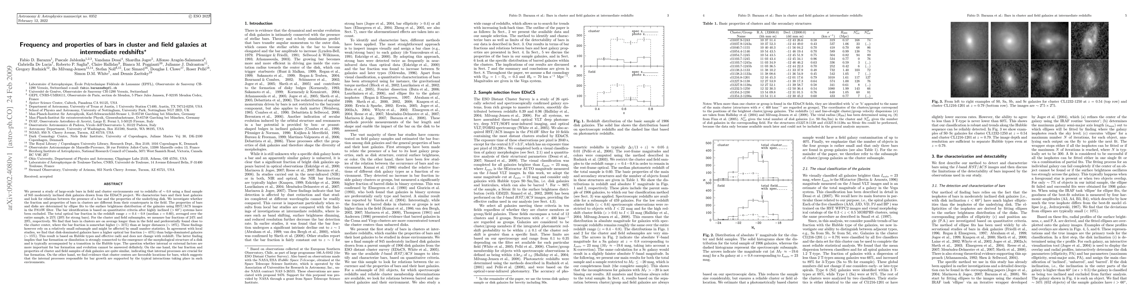 This study examines the frequency and properties of bars in galaxies at intermediate redshifts (z=0.4-0.8) using a sample of 945 disk galaxies from the EDisCS project. The research finds that the overall bar fraction is 25%, with bars in clusters being longer and more centrally located compared to those in the field, suggesting a connection between bar formation and galaxy morphology.