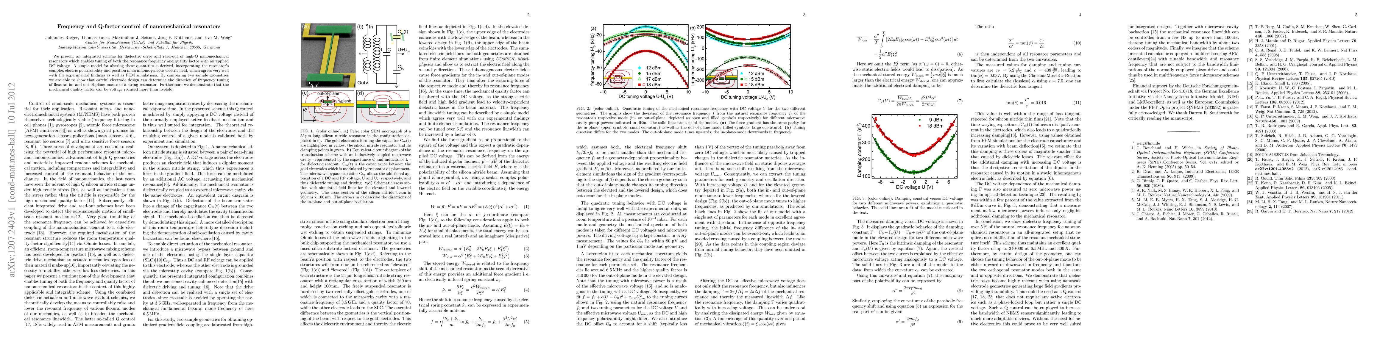 This paper presents an integrated method for controlling the resonance frequency and quality factor of high-Q nanomechanical resonators via dielectric drive and read-out, showing that electrode design can influence frequency tuning and demonstrating a more than fivefold reduction in the mechanical quality factor. The model aligns well with experimental results and FEM simulations.