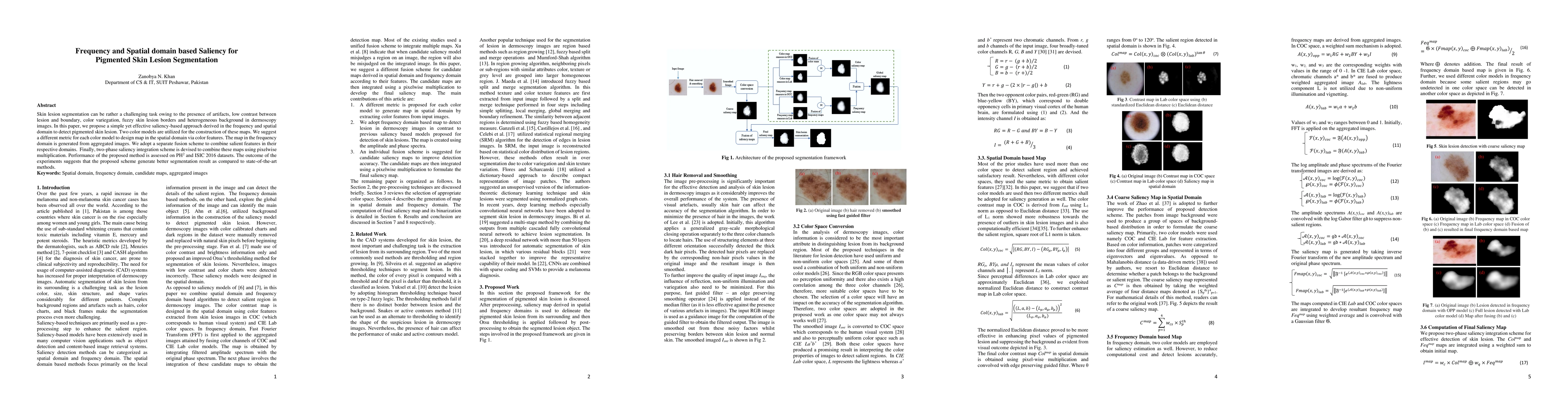 Skin lesion segmentation can be rather a challenging task owing to the presence of artifacts, low contrast between lesion and boundary, color variegation, fuzzy skin lesion borders and heterogeneous background in dermoscopy images. In this paper, we propose a simple yet effective saliency-based approach derived in the frequency and spatial domain to detect pigmented skin lesion. Two color models are utilized for the construction of these maps. We suggest a different metric for each color model to design map in the spatial domain via color features. The map in the frequency domain is generated from aggregated images. We adopt a separate fusion scheme to combine salient features in their respective domains. Finally, two-phase saliency integration scheme is devised to combine these maps using pixelwise multiplication. Performance of the proposed method is assessed on PH2 and ISIC 2016 datasets. The outcome of the experiments suggests that the proposed scheme generate better segmentation result as compared to state-of-the-art methods.