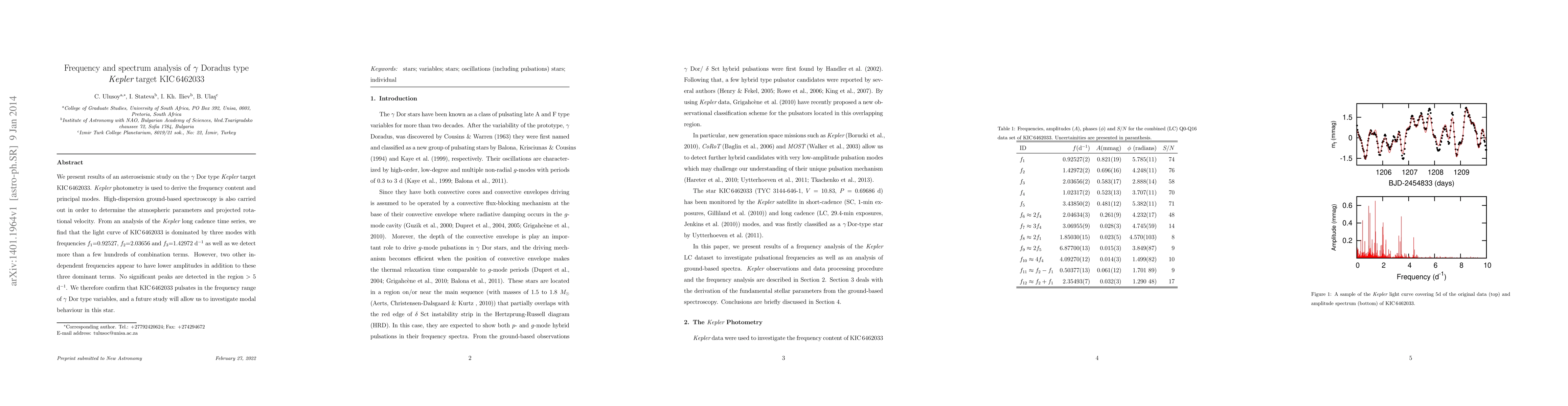 We present results of an asteroseismic study on the $\gamma$ Dor type {\it Kepler} target KIC\,6462033. {\it Kepler} photometry is used to derive the frequency content and principal modes. High-dispersion ground-based spectroscopy is also carried out in order to determine the atmospheric parameters and projected rotational velocity. From an analysis of the {\it Kepler} long cadence time series, we find that the light curve of KIC\,6462033 is dominated by three modes with frequencies $f_{1}$=0.92527, $f_{2}$=2.03656 and $f_{3}$=1.42972 d$^{-1}$ as well as we detect more than a few hundreds of combination terms. However, two other independent frequencies appear to have lower amplitudes in addition to these three dominant terms. No significant peaks are detected in the region $>$ 5 d$^{-1}$. We therefore confirm that KIC\,6462033 pulsates in the frequency range of $\gamma$ Dor type variables, and a future study will allow us to investigate modal behaviour in this star.