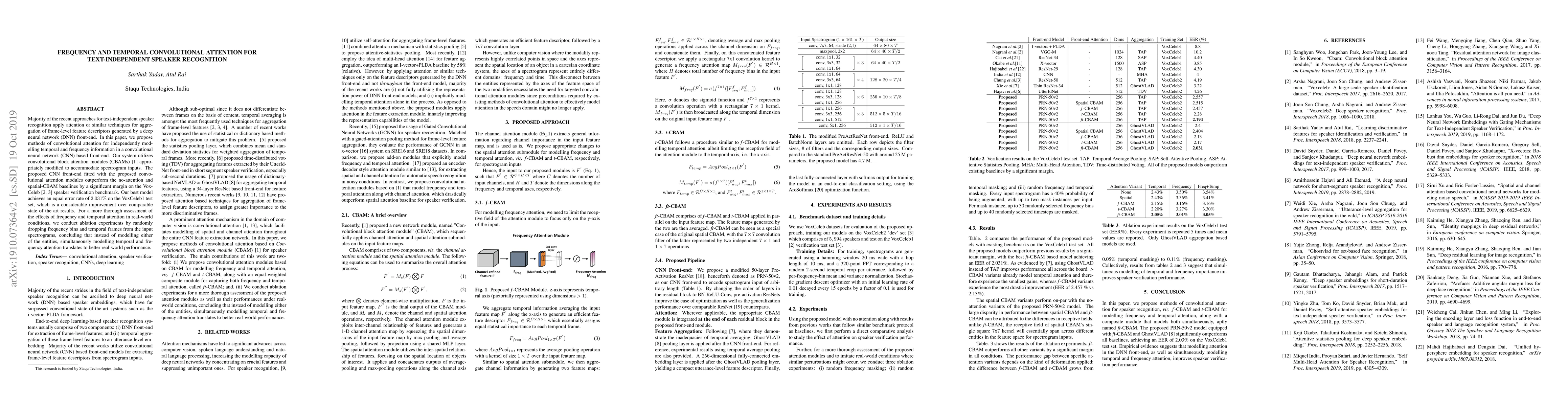 Majority of the recent approaches for text-independent speaker recognition apply attention or similar techniques for aggregation of frame-level feature descriptors generated by a deep neural network (DNN) front-end. In this paper, we propose methods of convolutional attention for independently modelling temporal and frequency information in a convolutional neural network (CNN) based front-end. Our system utilizes convolutional block attention modules (CBAMs) [1] appropriately modified to accommodate spectrogram inputs. The proposed CNN front-end fitted with the proposed convolutional attention modules outperform the no-attention and spatial-CBAM baselines by a significant margin on the VoxCeleb [2, 3] speaker verification benchmark, and our best model achieves an equal error rate of 2:031% on the VoxCeleb1 test set, improving the existing state of the art result by a significant margin. For a more thorough assessment of the effects of frequency and temporal attention in real-world conditions, we conduct ablation experiments by randomly dropping frequency bins and temporal frames from the input spectrograms, concluding that instead of modelling either of the entities, simultaneously modelling temporal and frequency attention translates to better real-world performance.