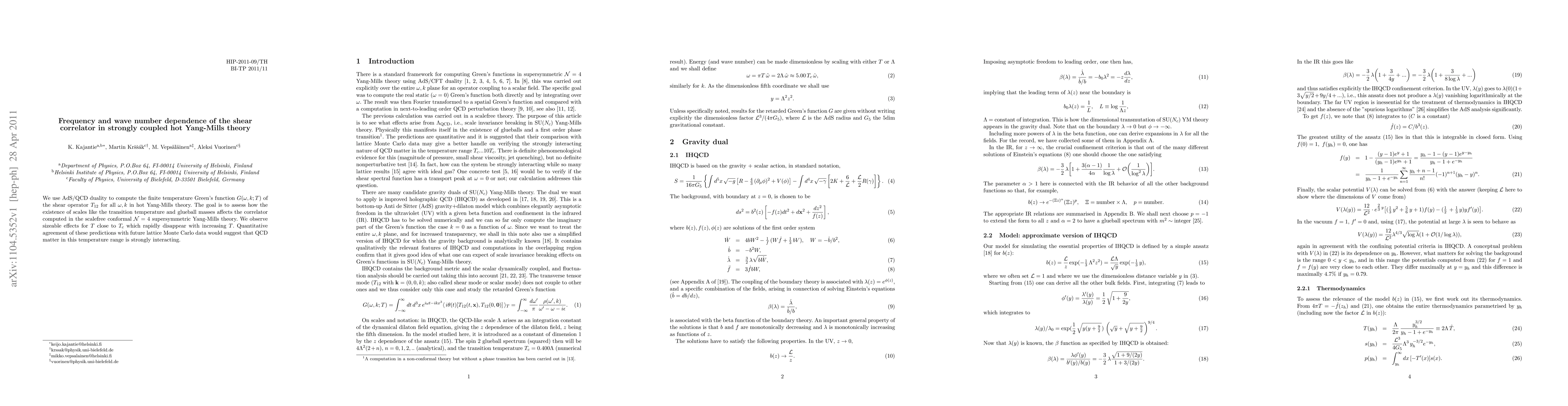 We use AdS/QCD duality to compute the finite temperature Green's function G(omega,k;T) of the shear operator T_12 for all omega,k in hot Yang-Mills theory. The goal is to assess how the existence of scales like the transition temperature and glueball masses affects the correlator computed in the scalefree conformal N=4 supersymmetric Yang-Mills theory. We observe sizeable effects for T close to T_c which rapidly disappear with increasing T. Quantitative agreement of these predictions with future lattice Monte Carlo data would suggest that QCD matter in this temperature range is strongly interacting.