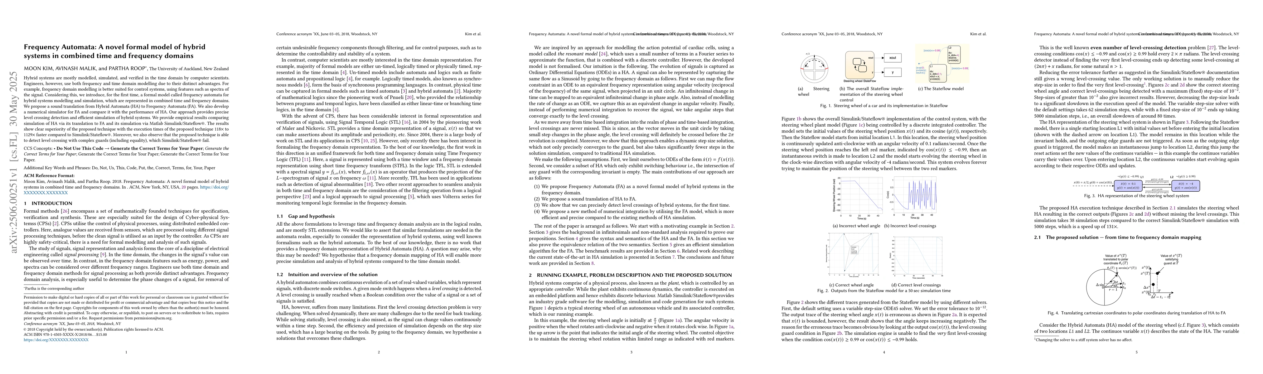 Hybrid systems are mostly modelled, simulated, and verified in the time domain by computer scientists. Engineers, however, use both frequency and time domain modelling due to their distinct advantages. For example, frequency domain modelling is better suited for control systems, using features such as spectra of the signal. Considering this, we introduce, for the first time, a formal model called frequency automata for hybrid systems modelling and simulation, which are represented in combined time and frequency domains. We propose a sound translation from Hybrid Automata (HA) to Frequency Automata (FA). We also develop a numerical simulator for FA and compare it with the performance of HA. Our approach provides precise level crossing detection and efficient simulation of hybrid systems. We provide empirical results comparing simulation of HA via its translation to FA and its simulation via Matlab Simulink/Stateflow. The results show clear superiority of the proposed technique with the execution times of the proposed technique 118x to 1129x faster compared to Simulink/Stateflow. Moreover, we also observe that the proposed technique is able to detect level crossing with complex guards (including equality), which Simulink/Stateflow fail.
