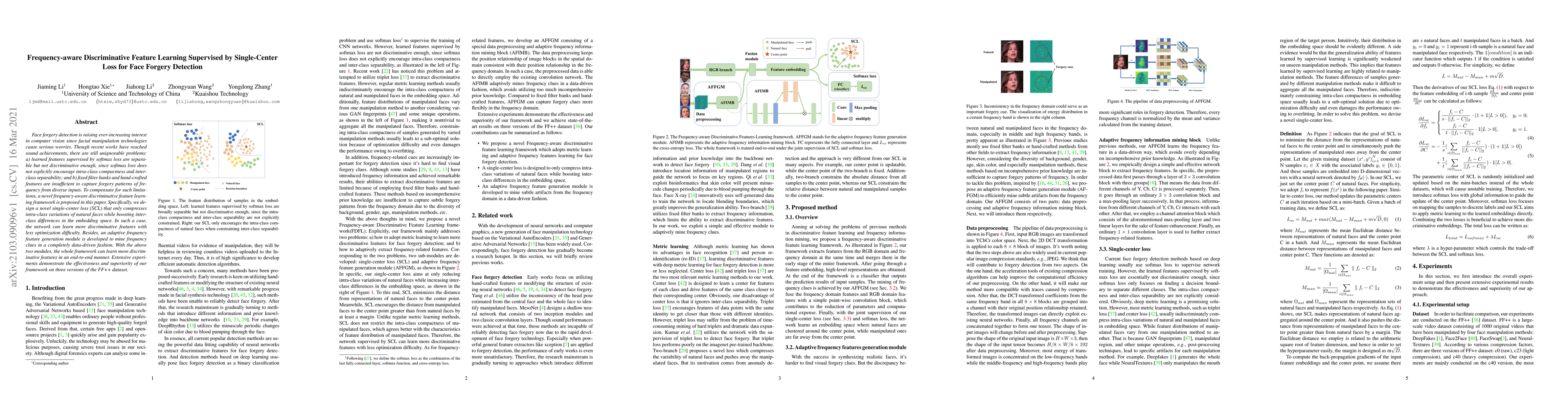 This paper proposes a novel frequency-aware discriminative feature learning framework for face forgery detection, utilizing a single-center loss to enhance inter-class separability and an adaptive frequency feature generation module to capture diverse forgery patterns. Experiments show superior performance on the FF++ dataset.