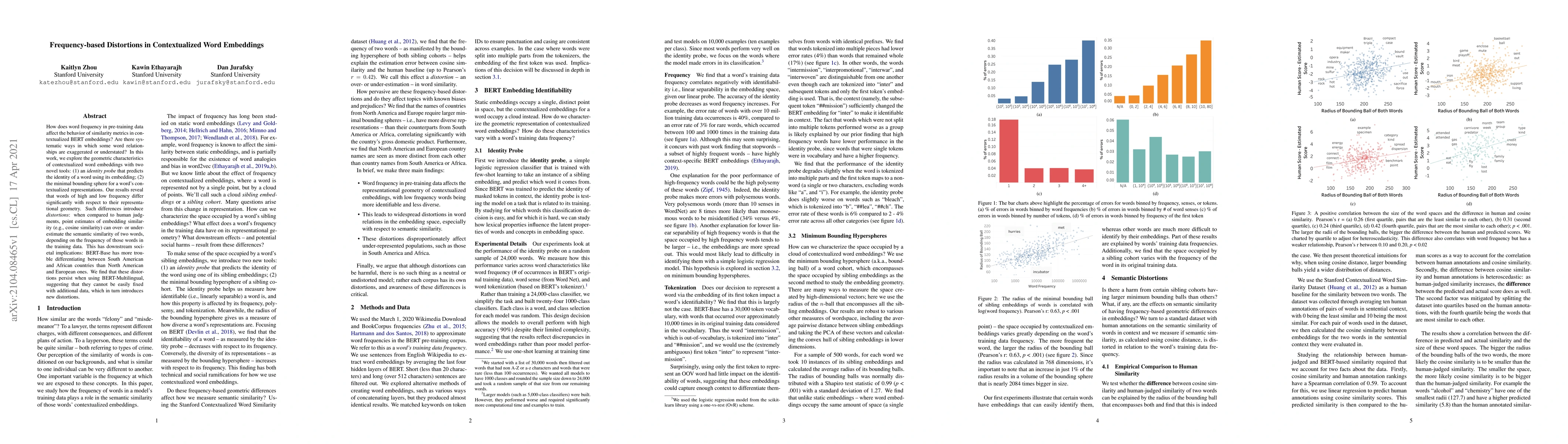 How does word frequency in pre-training data affect the behavior of similarity metrics in contextualized BERT embeddings? Are there systematic ways in which some word relationships are exaggerated or understated? In this work, we explore the geometric characteristics of contextualized word embeddings with two novel tools: (1) an identity probe that predicts the identity of a word using its embedding; (2) the minimal bounding sphere for a word's contextualized representations. Our results reveal that words of high and low frequency differ significantly with respect to their representational geometry. Such differences introduce distortions: when compared to human judgments, point estimates of embedding similarity (e.g., cosine similarity) can over- or under-estimate the semantic similarity of two words, depending on the frequency of those words in the training data. This has downstream societal implications: BERT-Base has more trouble differentiating between South American and African countries than North American and European ones. We find that these distortions persist when using BERT-Multilingual, suggesting that they cannot be easily fixed with additional data, which in turn introduces new distortions.