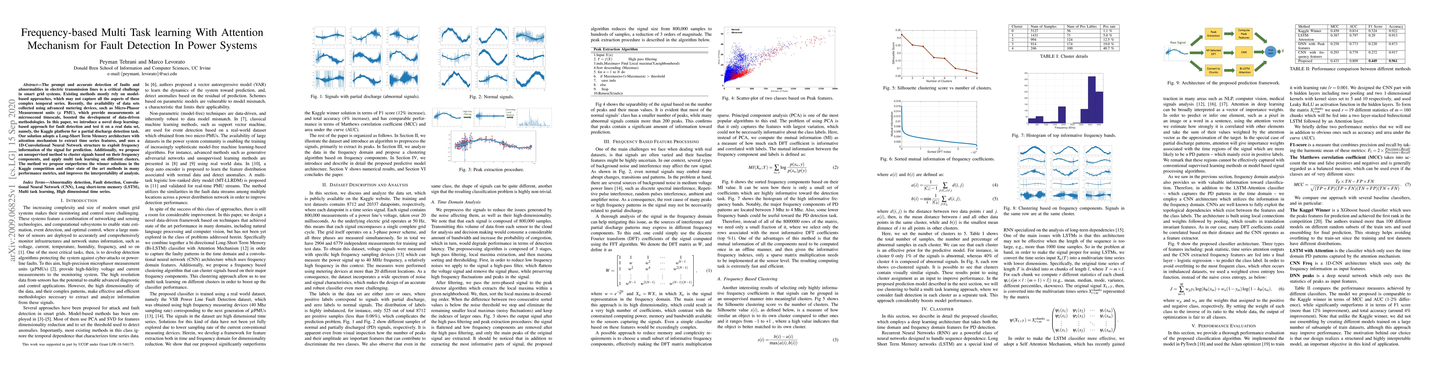 The prompt and accurate detection of faults and abnormalities in electric transmission lines is a critical challenge in smart grid systems. Existing methods mostly rely on model-based approaches, which may not capture all the aspects of these complex temporal series. Recently, the availability of data sets collected using advanced metering devices, such as Micro-Phasor Measurement units ($\mu$ PMU), which provide measurements at microsecond timescale, boosted the development of data-driven methodologies. In this paper, we introduce a novel deep learning-based approach for fault detection and test it on a real data set, namely, the Kaggle platform for a partial discharge detection task. Our solution adopts a Long-Short Term Memory architecture with attention mechanism to extract time series features, and uses a 1D-Convolutional Neural Network structure to exploit frequency information of the signal for prediction. Additionally, we propose an unsupervised method to cluster signals based on their frequency components, and apply multi task learning on different clusters. The method we propose outperforms the winner solutions in the Kaggle competition and other state of the art methods in many performance metrics, and improves the interpretability of analysis.