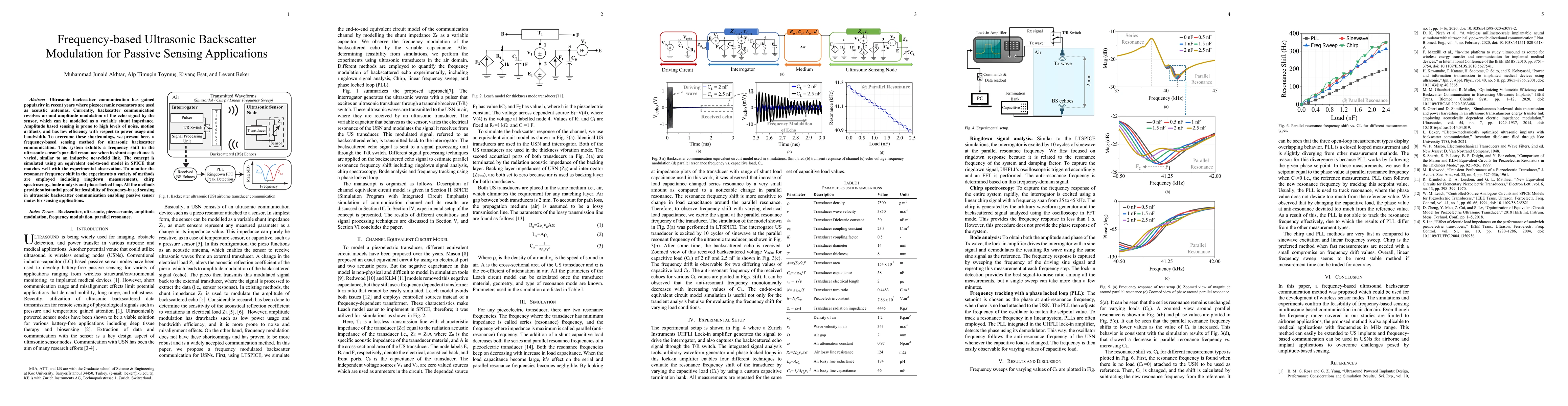 This paper proposes a frequency-based ultrasonic backscatter modulation method to improve passive sensing over amplitude modulation, demonstrating a frequency shift in resonance due to varying shunt capacitance, which is validated through simulations and various experimental techniques. The method shows promise for enhancing efficiency and reducing noise in passive sensor networks.