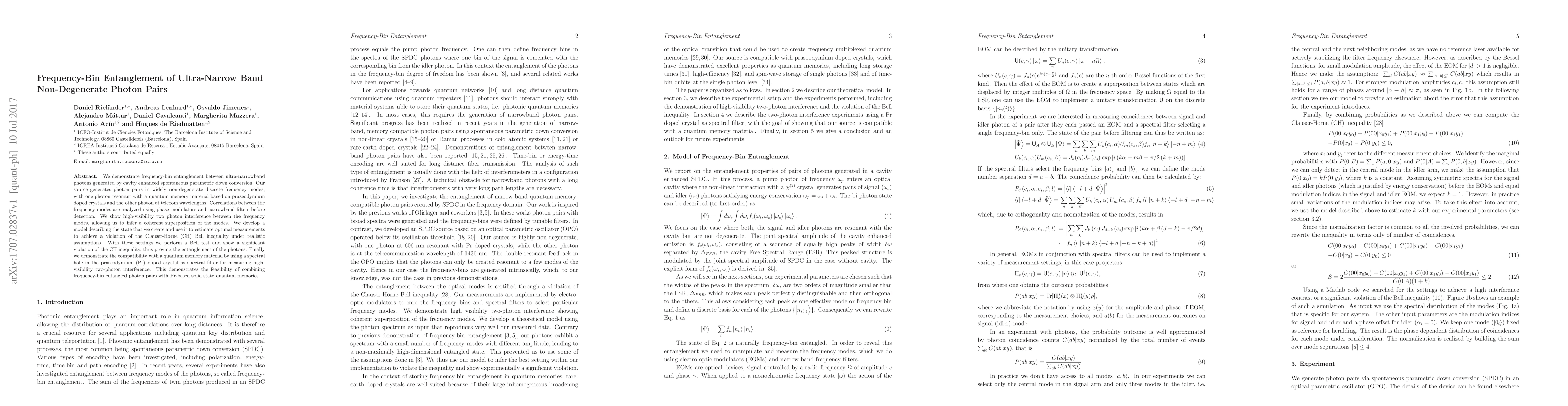 This paper demonstrates frequency-bin entanglement of ultra-narrowband photon pairs generated via cavity-enhanced spontaneous parametric down conversion. It shows high-visibility two-photon interference and a significant violation of the CH Bell inequality, proving entanglement, and explores compatibility with praseodymium-doped crystal quantum memory materials.