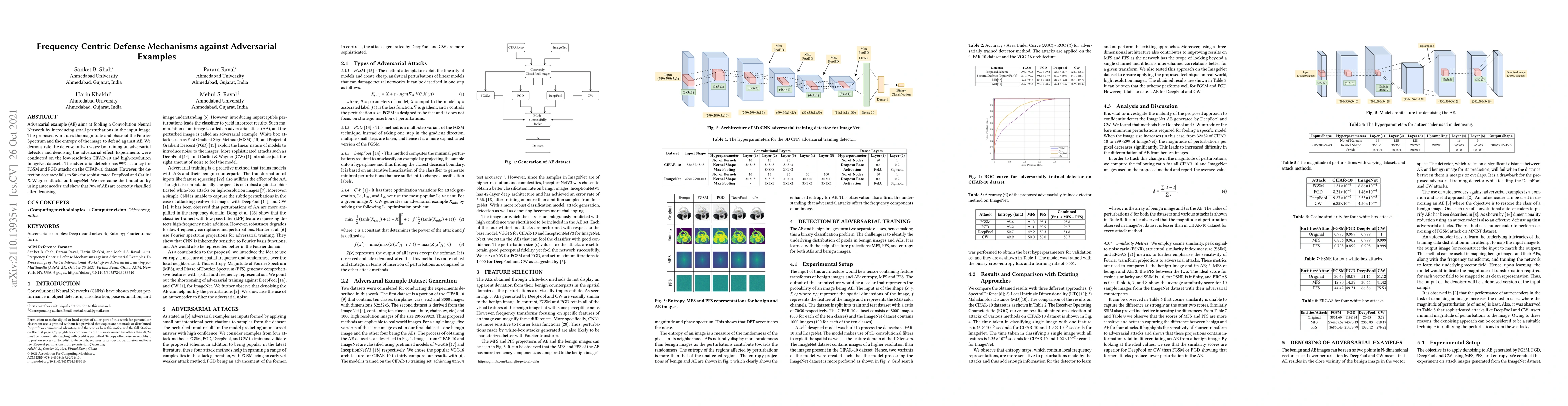 Adversarial example (AE) aims at fooling a Convolution Neural Network by introducing small perturbations in the input image.The proposed work uses the magnitude and phase of the Fourier Spectrum and the entropy of the image to defend against AE. We demonstrate the defense in two ways: by training an adversarial detector and denoising the adversarial effect. Experiments were conducted on the low-resolution CIFAR-10 and high-resolution ImageNet datasets. The adversarial detector has 99% accuracy for FGSM and PGD attacks on the CIFAR-10 dataset. However, the detection accuracy falls to 50% for sophisticated DeepFool and Carlini & Wagner attacks on ImageNet. We overcome the limitation by using autoencoder and show that 70% of AEs are correctly classified after denoising.