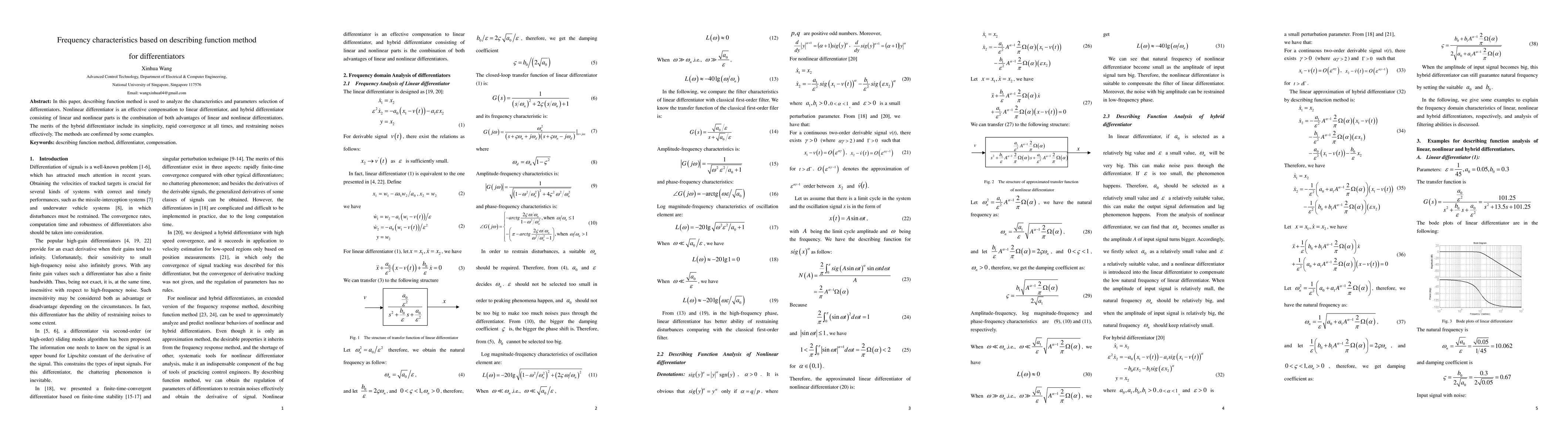 In this paper, describing function method is used to analyze the characteristics and parameters selection of differentiators. Nonlinear differentiator is an effective compensation to linear differentiator, and hybrid differentiator consisting of linear and nonlinear parts is the combination of both advantages of linear and nonlinear differentiators. The merits of the hybrid differentiator include its simplicity, rapid convergence at all times, and restraining noises effectively. The methods are confirmed by some examples.