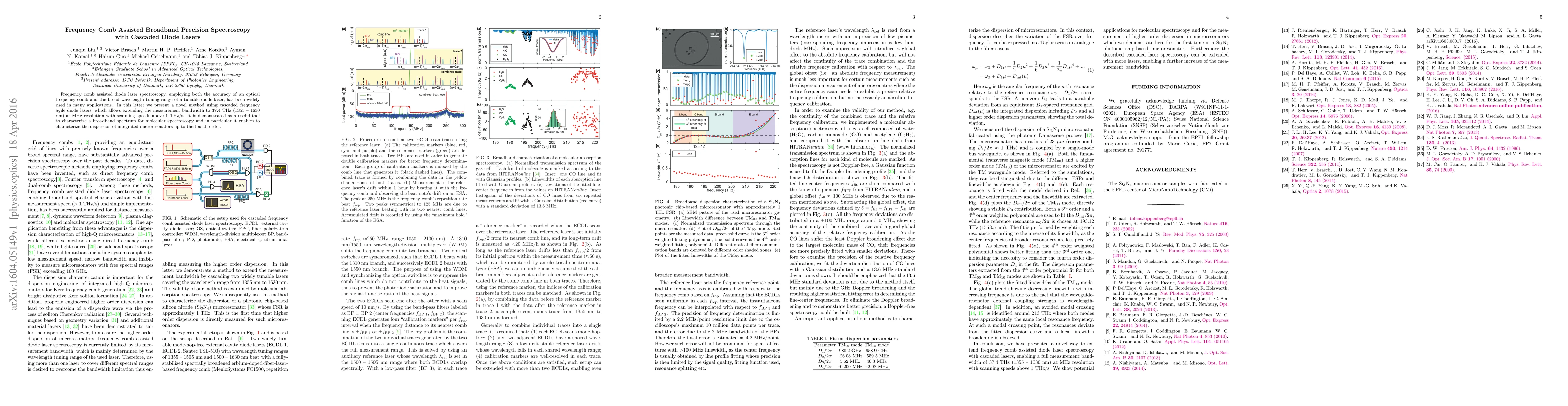 Frequency comb assisted diode laser spectroscopy, employing both the accuracy of an optical frequency comb and the broad wavelength tuning range of a tunable diode laser, has been widely used in many applications. In this letter we present a novel method using cascaded frequency agile diode lasers, which allows extending the measurement bandwidth to 37.4 THz (1355 to 1630 nm) at MHz resolution with scanning speeds above 1 THz/s. It is demonstrated as a useful tool to characterize a broadband spectrum for molecular spectroscopy and in particular it enables to characterize the dispersion of integrated microresonators up to the fourth order.
