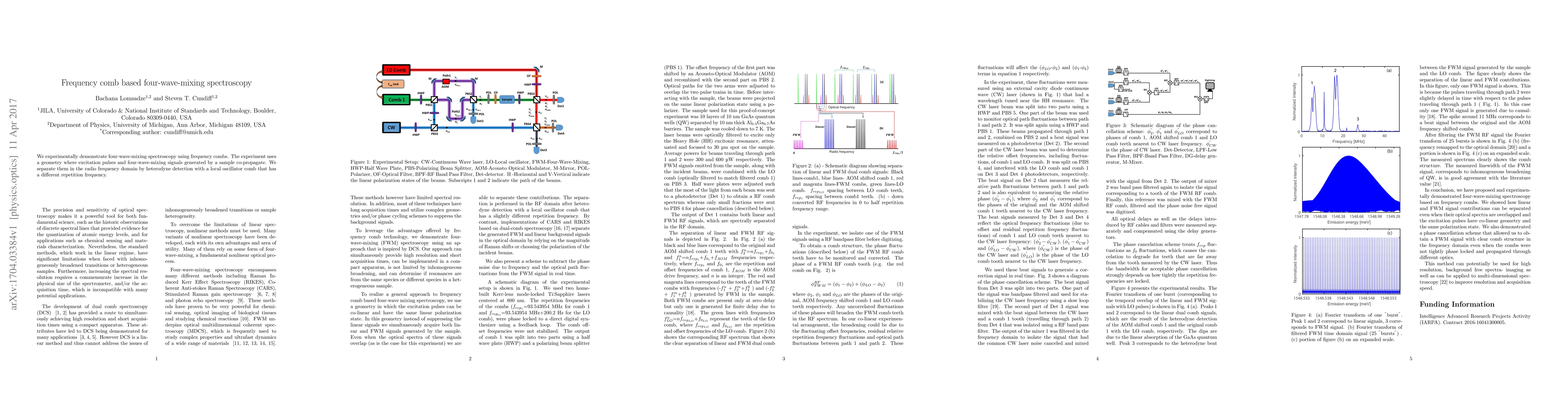 This research demonstrates four-wave-mixing spectroscopy utilizing frequency combs, achieving co-propagation of excitation pulses and generated signals, which are then separated by heterodyne detection with a local oscillator comb differing in repetition frequency.