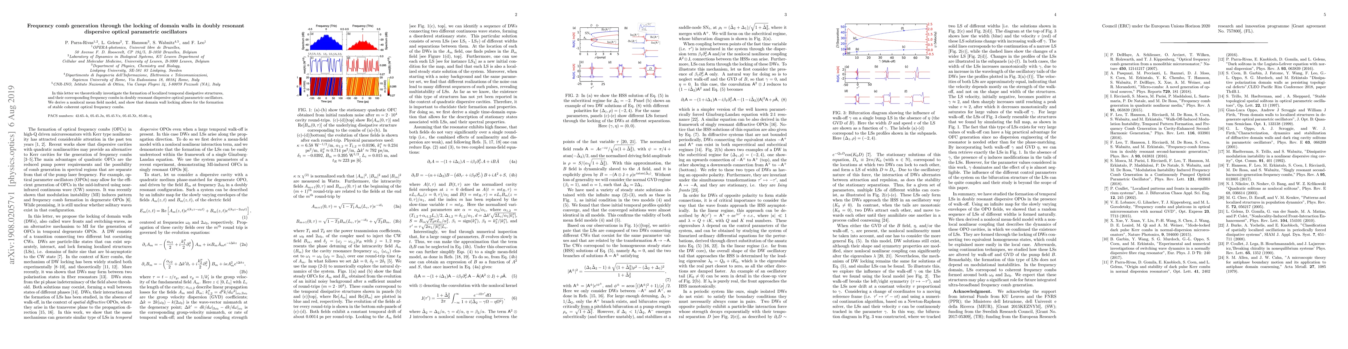 This paper theoretically explores the generation of stable coherent optical frequency combs via the locking of domain walls in doubly resonant dispersive optical parametric oscillators, using a derived nonlocal mean field model. Domain wall locking is shown to facilitate the formation of localized temporal dissipative structures.