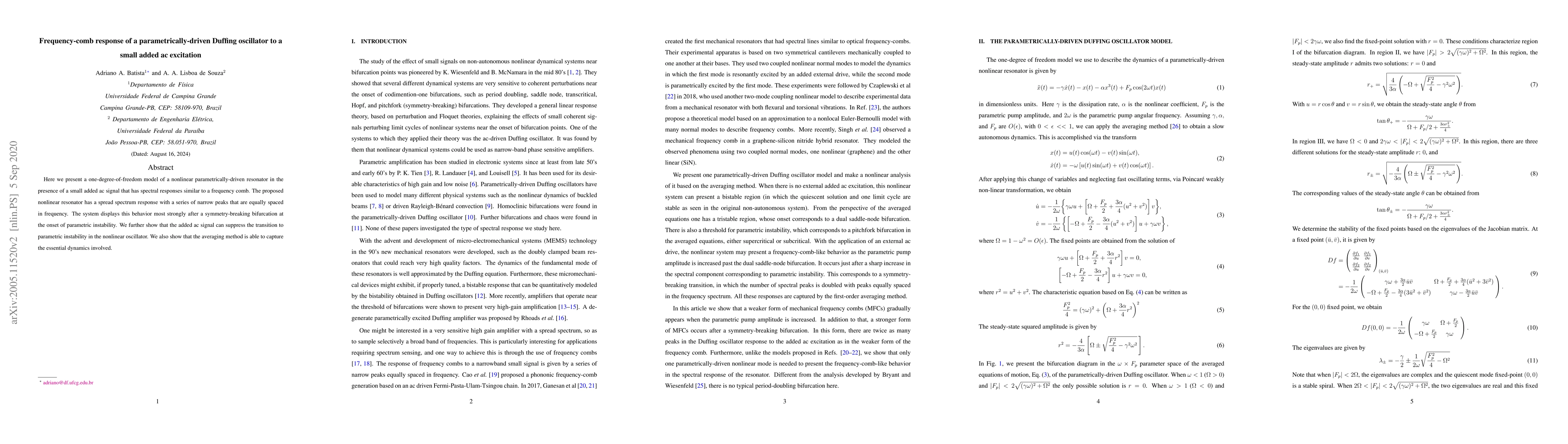 This paper investigates a nonlinear parametrically-driven Duffing oscillator subjected to a small added ac excitation, revealing a frequency-comb response characterized by equally spaced narrow peaks. The system exhibits this behavior prominently post-bifurcation, and the added ac signal can inhibit the transition to parametric instability, with the averaging method effectively capturing the dynamics.