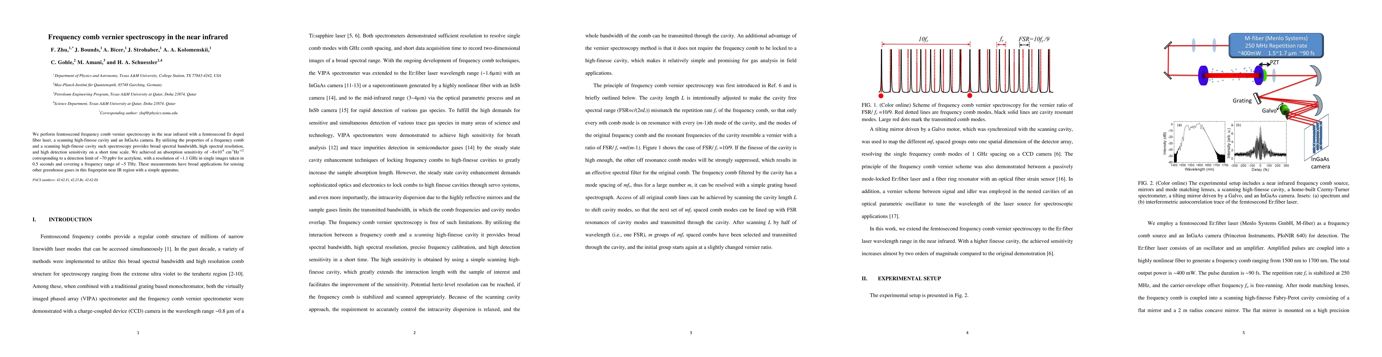This research demonstrates femtosecond frequency comb vernier spectroscopy using an Er-doped fiber laser and a high-finesse cavity to achieve high spectral resolution and sensitivity in the near infrared. It achieves an absorption sensitivity of ~8E-8 cm-1Hz-1/2, detecting acetylene at 70 ppbv with a resolution of ~1.1 GHz in 0.5 seconds, showcasing potential for greenhouse gas sensing.