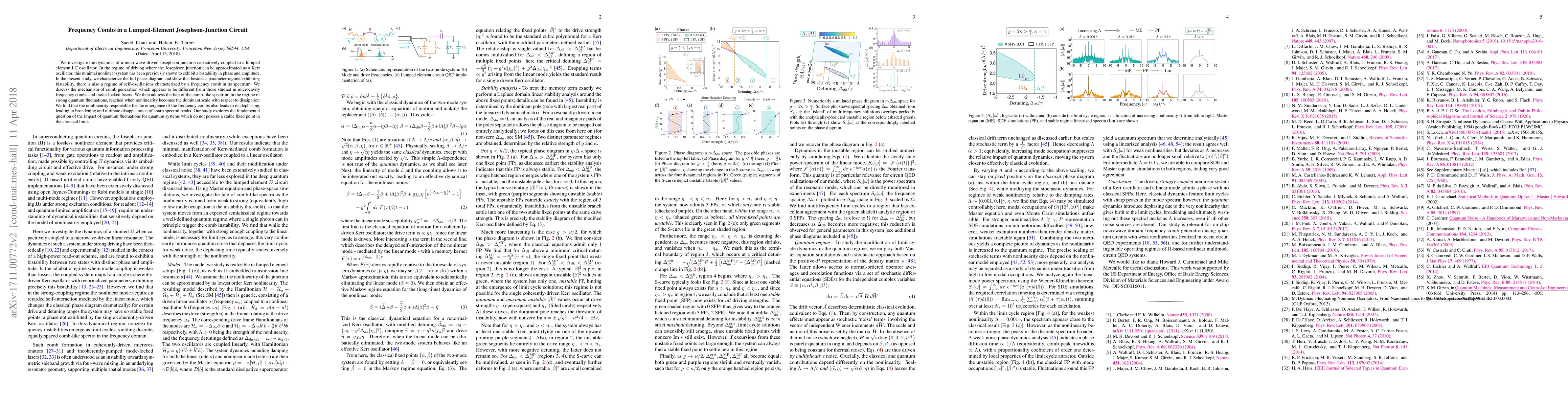 We investigate the dynamics of a microwave-driven Josephson junction capacitively coupled to a lumped element LC oscillator. In the regime of driving where the Josephson junction can be approximated as a Kerr oscillator, this minimal nonlinear system has been previously shown to exhibit a bistability in phase and amplitude. In the present study, we characterize the full phase diagram and show that besides a parameter regime exhibiting bistability, there is also a regime of self-oscillations characterized by a frequency comb in its spectrum. We discuss the mechanism of comb generation which appears to be different from those studied in microcavity frequency combs and mode-locked lasers. We then address the fate of the comb-like spectrum in the regime of strong quantum fluctuations, reached when nonlinearity becomes the dominant scale with respect to dissipation. We find that the nonlinearity responsible for the emergence of the frequency combs also leads to its dephasing, leading to broadening and ultimate disappearance of sharp spectral peaks. Our study explores the fundamental question of the impact of quantum fluctuations for quantum systems which do not possess a stable fixed point in the classical limit.
