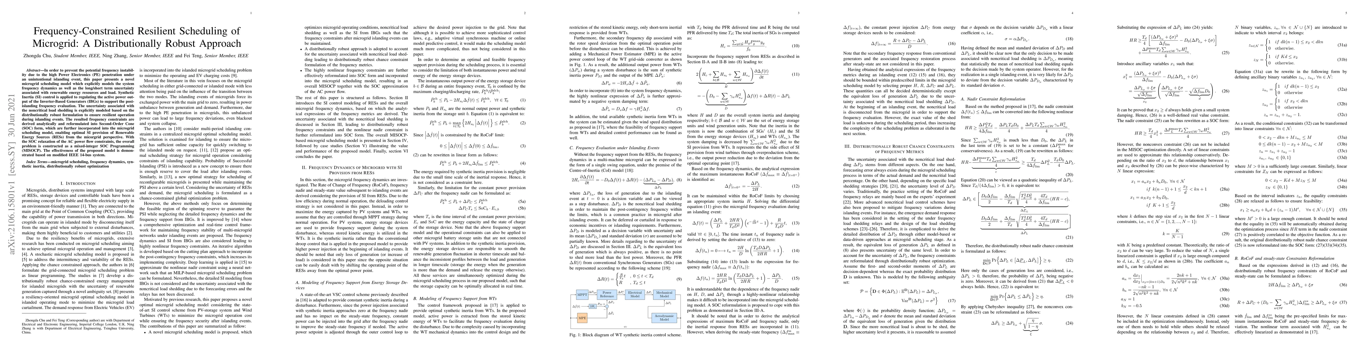 This paper proposes a distributionally robust scheduling model for microgrids to prevent frequency instability during islanding events, incorporating synthetic inertia control and distributionally robust uncertainty modeling for resilient operation. The model is formulated as a mixed-integer Second-Order Cone Programming (MISOCP) problem and validated on a modified IEEE 14-bus system.