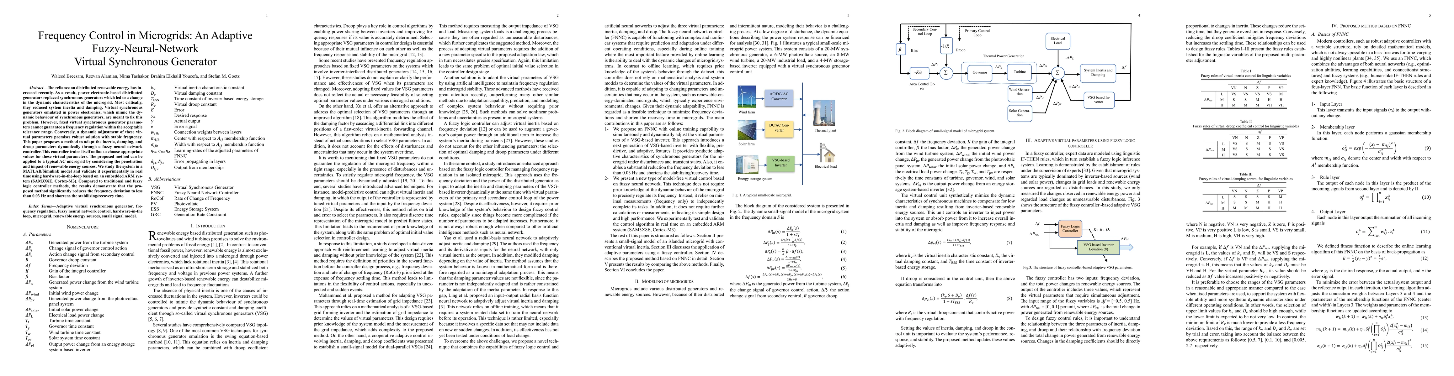 The reliance on distributed renewable energy has increased recently. As a result, power electronic-based distributed generators replaced synchronous generators which led to a change in the dynamic characteristics of the microgrid. Most critically, they reduced system inertia and damping. Virtual synchronous generators emulated in power electronics, which mimic the dynamic behaviour of synchronous generators, are meant to fix this problem. However, fixed virtual synchronous generator parameters cannot guarantee a frequency regulation within the acceptable tolerance range. Conversely, a dynamic adjustment of these virtual parameters promises robust solution with stable frequency. This paper proposes a method to adapt the inertia, damping, and droop parameters dynamically through a fuzzy neural network controller. This controller trains itself online to choose appropriate values for these virtual parameters. The proposed method can be applied to a typical AC microgrid by considering the penetration and impact of renewable energy sources. We study the system in a MATLAB/Simulink model and validate it experimentally in real time using hardware-in-the-loop based on an embedded ARM system (SAM3X8E, Cortex-M3). Compared to traditional and fuzzy logic controller methods, the results demonstrate that the proposed method significantly reduces the frequency deviation to less than 0.03 Hz and shortens the stabilizing/recovery time.