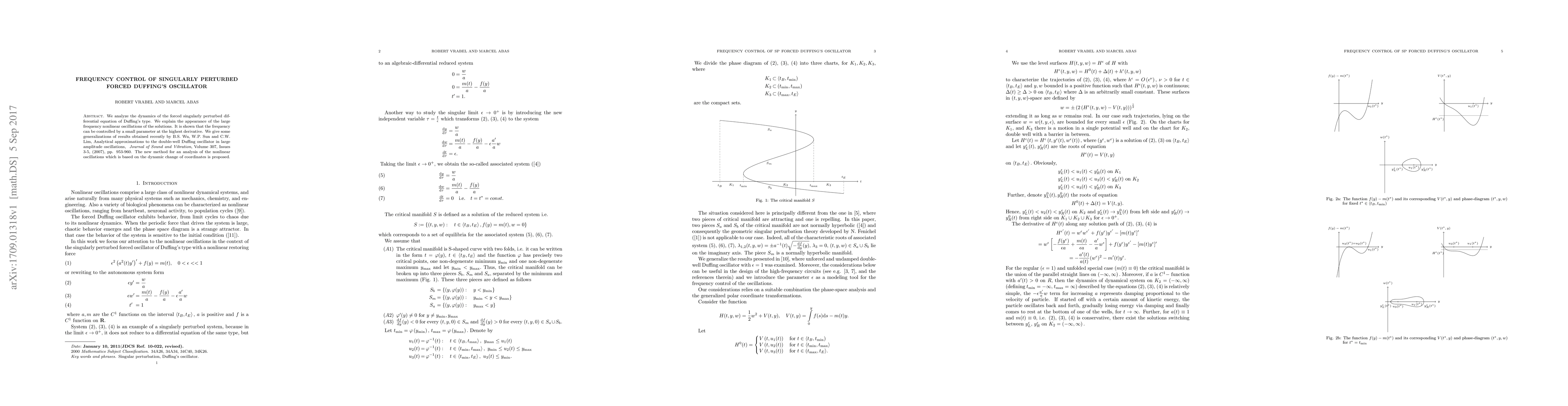 We analyze the dynamics of the forced singularly perturbed differential equation of Duffing's type. We explain the appearance of the large frequency nonlinear oscillations of the solutions. It is shown that the frequency can be controlled by a small parameter at the highest derivative. We give some generalizations of results obtained recently by B.S. Wu, W.P. Sun and C.W. Lim, Analytical approximations to the double-well Duffing oscillator in large amplitude oscillations, Journal of Sound and Vibration, Volume 307, Issues 3-5, (2007), pp. 953-960. The new method for an analysis of the nonlinear oscillations which is based on the dynamic change of coordinates is proposed.