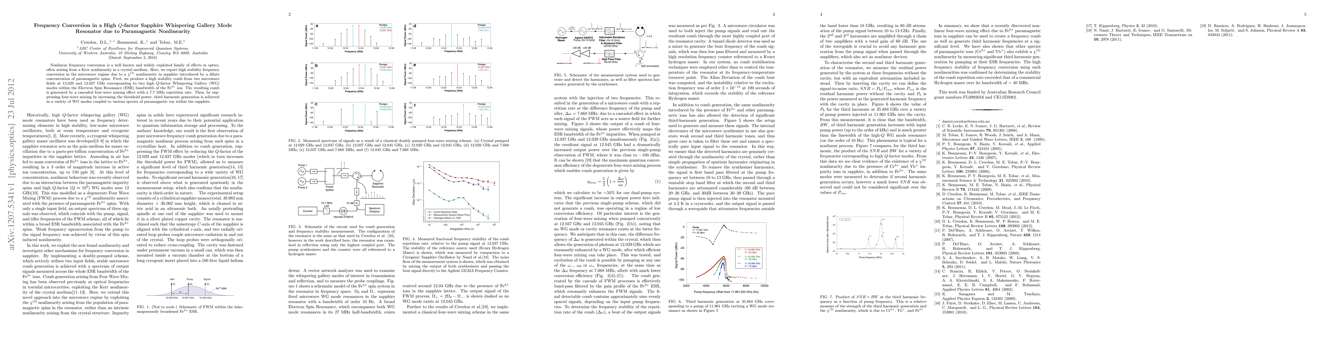 Nonlinear frequency conversion is a well known and widely exploited family of effects in optics, often arising from a Kerr nonlinearity in a crystal medium. Here, we report high stability frequency conversion in the microwave regime due to a $\chi^{(3)}$ nonlinearity in sapphire introduced by a dilute concentration of paramagnetic spins. First, we produce a high stability comb from two microwave fields at 12.029 and 12.037 GHz corresponding to two high $Q$-factor Whispering Gallery (WG) modes within the Electron Spin Resonance (ESR) bandwidth of the Fe$^{3+}$ ion. The resulting comb is generated by a cascaded four-wave mixing effect with a 7.7 MHz repetition rate. Then, by suppressing four-wave mixing by increasing the threshold power, third harmonic generation is achieved in a variety of WG modes coupled to various species of paramagnetic ion within the sapphire.