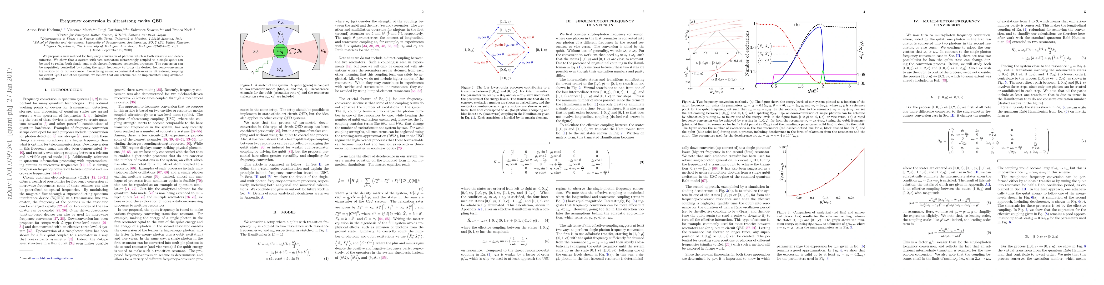 We propose a new method for frequency conversion of photons which is both versatile and deterministic. We show that a system with two resonators ultrastrongly coupled to a single qubit can be used to realize both single- and multiphoton frequency-conversion processes. The conversion can be exquisitely controlled by tuning the qubit frequency to bring the desired frequency-conversion transitions on or off resonance. Considering recent experimental advances in ultrastrong coupling for circuit QED and other systems, we believe that our scheme can be implemented using available technology.