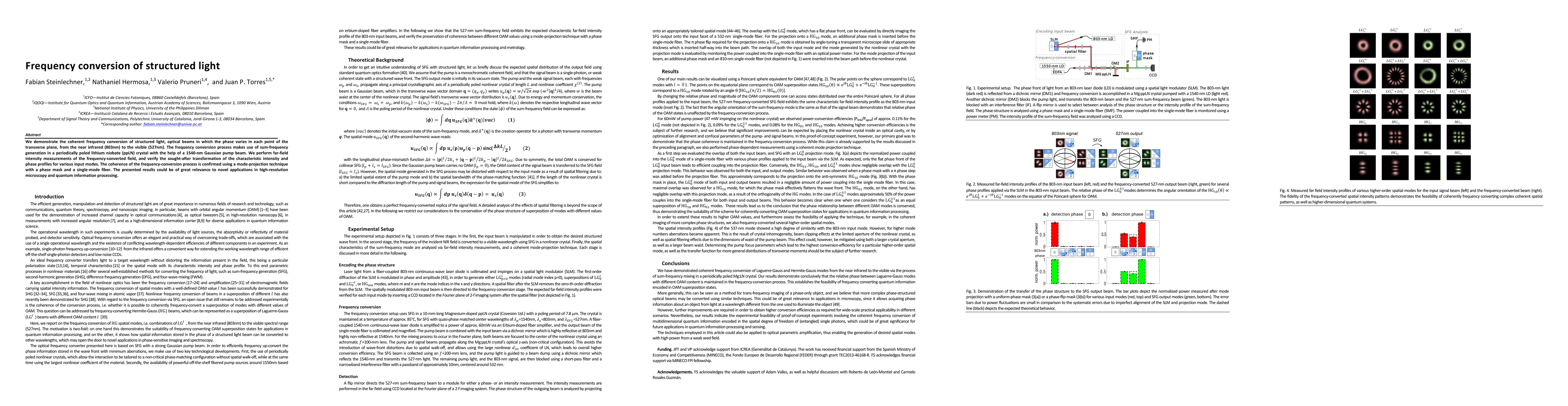 This research demonstrates coherent frequency conversion of structured light from near infrared to visible wavelengths using sum-frequency generation in a periodically poled lithium niobate crystal. The study verifies the transformation of intensity and phase profiles and confirms coherence through mode-projection techniques, promising applications in microscopy and quantum information.