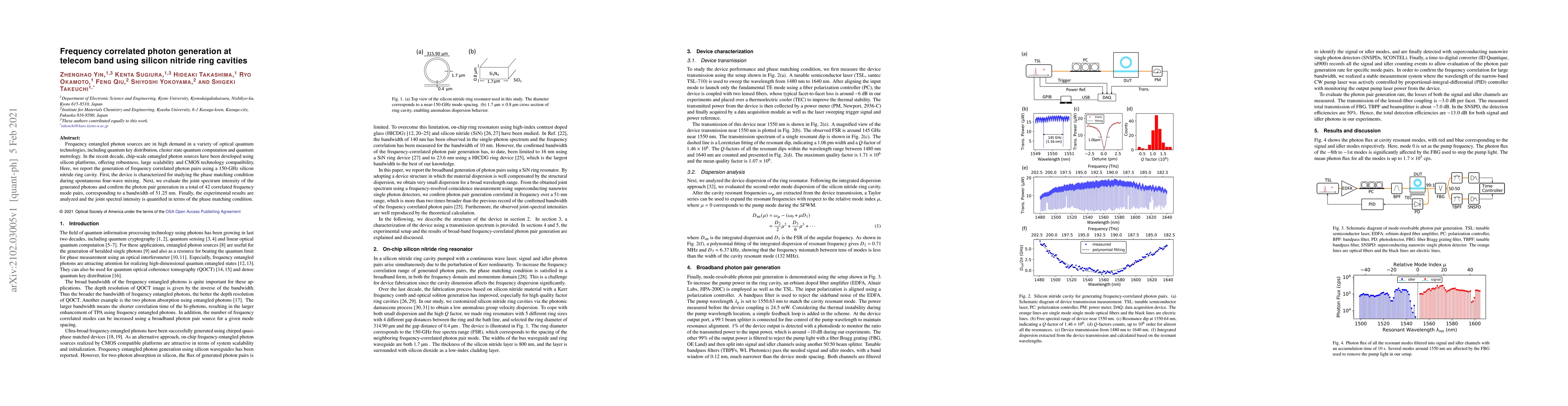 This paper reports the generation of frequency correlated photon pairs using a silicon nitride ring cavity at the telecom band. The study characterizes the phase matching condition during spontaneous four-wave mixing and confirms the generation of 42 correlated frequency mode pairs within a 51.25 nm bandwidth.