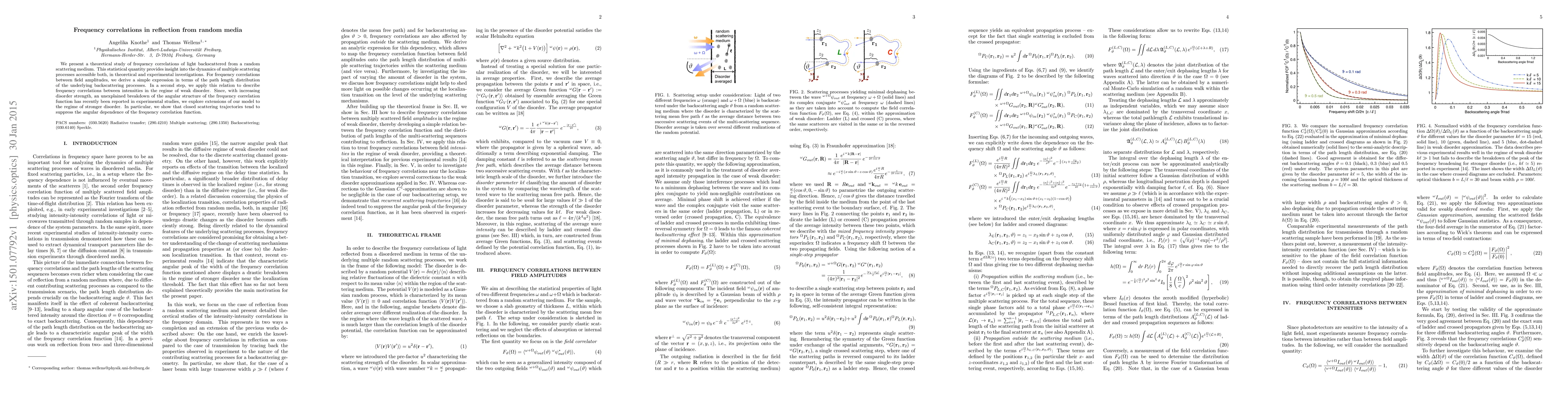 This paper theoretically investigates frequency correlations in light backscattered from random media, deriving expressions for these correlations in terms of path length distributions and exploring their behavior under weak and stronger disorder. It finds that closed scattering trajectories diminish the angular dependence of frequency correlation functions.