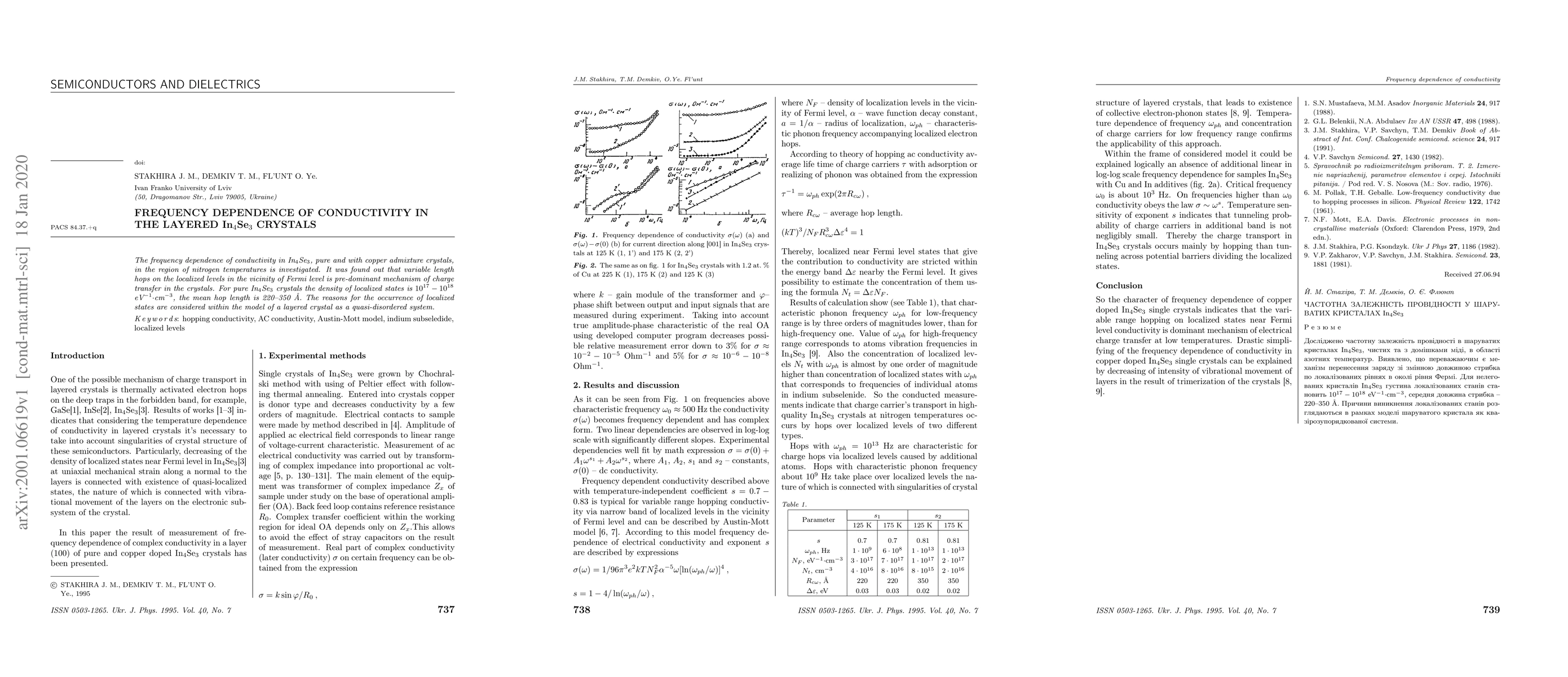 This study investigates the frequency dependence of conductivity in pure and copper-doped In$_4$Se$_3$ crystals at nitrogen temperatures, revealing that charge transfer is primarily due to variable length hops on localized states near the Fermi level. Pure In$_4$Se$_3$ crystals exhibit a density of localized states between $10^{17}$ and $10^{18}$ eV$^{-1}\cdot$cm$^{-3}$ and mean hop lengths of 220-350 Å, with localized states attributed to the quasi-disordered nature of the layered crystal structure.