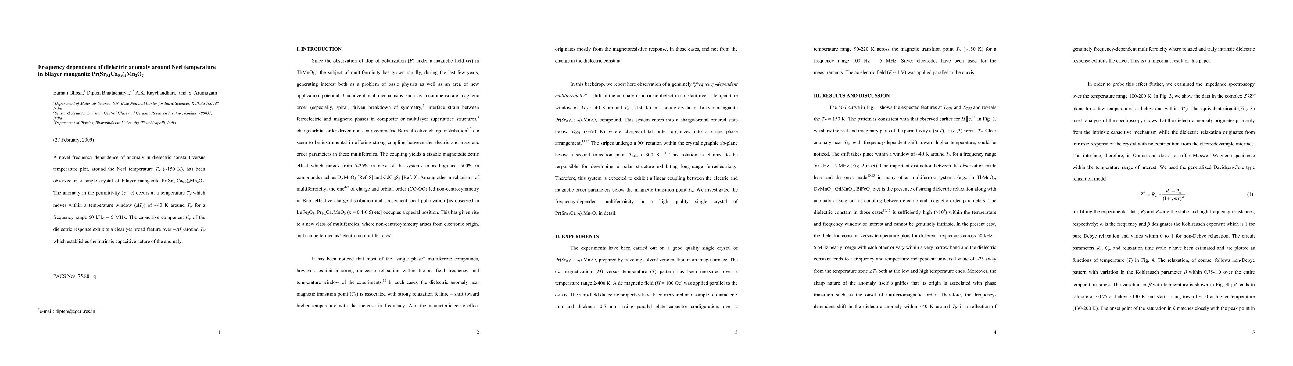 The research observes a unique frequency-dependent dielectric anomaly around the Neel temperature (T_N ~150 K) in Pr(Sr0.1Ca0.9)2Mn2O7 crystal. This anomaly, characterized by a shift in temperature (T_f) within ~40 K of T_N for frequencies 50 kHz-5 MHz, is linked to an intrinsic capacitive response, revealing new insights into the material's magnetic properties.