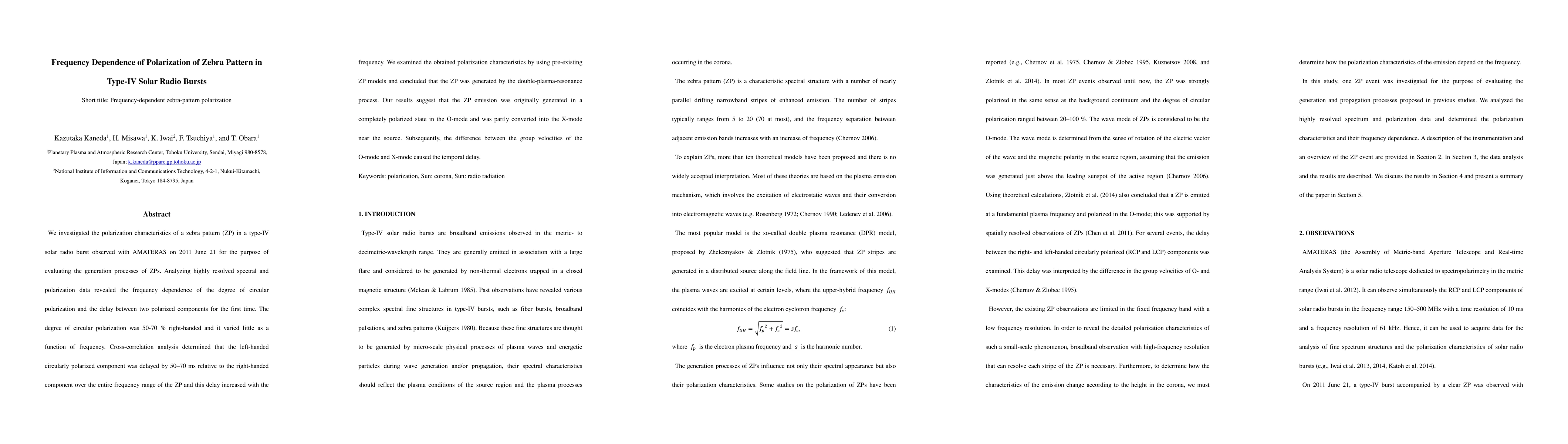 Researchers studied a zebra pattern in type-IV solar radio bursts, finding that its polarization varies with frequency and is likely generated by the double plasma resonance process.