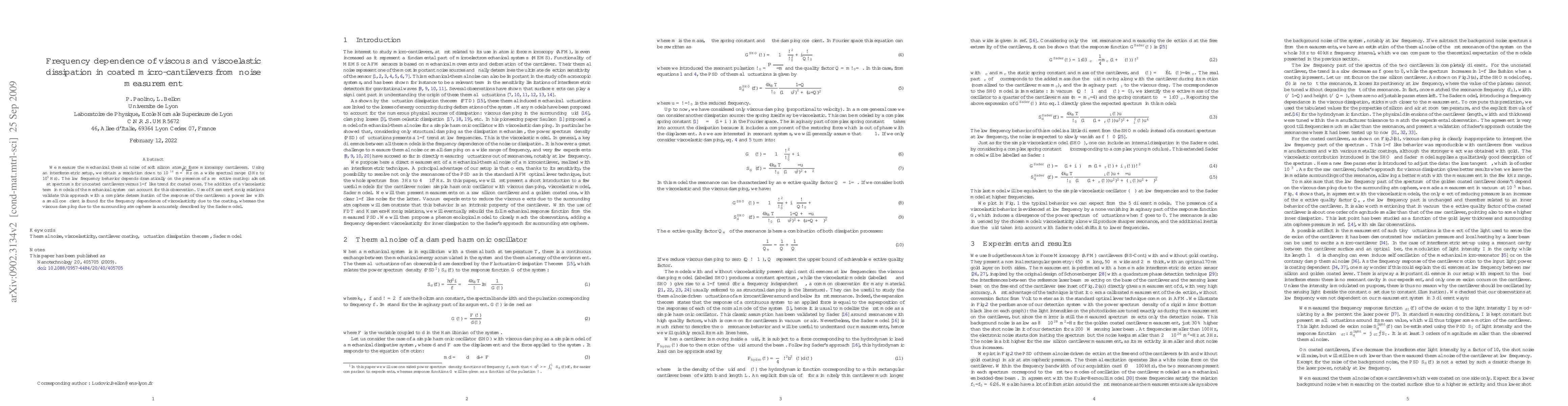 We measure the mechanical thermal noise of soft silicon atomic force microscopy cantilevers. Using an interferometric setup, we have a resolution down to 1E-14 m/rtHz on a wide spectral range (3 Hz to 1E5 Hz). The low frequency behavior depends dramatically on the presence of a reflective coating: almost flat spectrums for uncoated cantilevers versus 1/f like trend for coated ones. The addition of a viscoelastic term in models of the mechanical system can account for this observation. Use of Kramers-Kronig relations validate this approach with a complete determination of the response of the cantilever: a power law with a small coefficient is found for the frequency dependence of viscoelasticity due to the coating, whereas the viscous damping due to the surrounding atmosphere is accurately described by the Sader model.