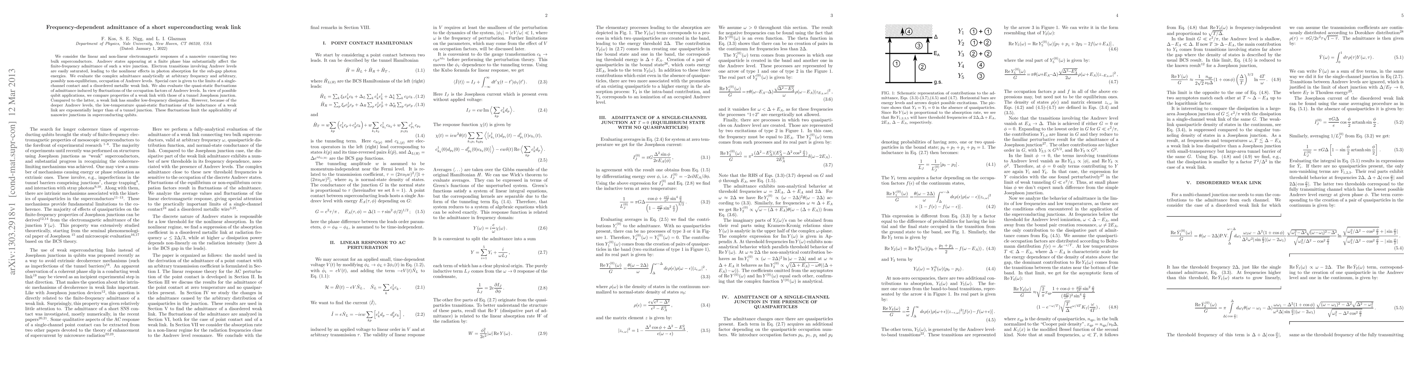 We consider the linear and non-linear electromagnetic responses of a nanowire connecting two bulk superconductors. Andreev states appearing at a finite phase bias substantially affect the finite-frequency admittance of such a wire junction. Electron transitions involving Andreev levels are easily saturated, leading to the nonlinear effects in photon absorption for the sub-gap photon energies. We evaluate the complex admittance analytically at arbitrary frequency and arbitrary, possibly non-equilibrium, occupation of Andreev levels. Special care is given to the limits of a single-channel contact and a disordered metallic weak link. We also evaluate the quasi-static fluctuations of admittance induced by fluctuations of the occupation factors of Andreev levels. In view of possible qubit applications, we compare properties of a weak link with those of a tunnel Josephson junction. Compared to the latter, a weak link has smaller low-frequency dissipation. However, because of the deeper Andreev levels, the low-temperature quasi-static fluctuations of the inductance of a weak link are exponentially larger than of a tunnel junction. These fluctuations limit the applicability of nanowire junctions in superconducting qubits.