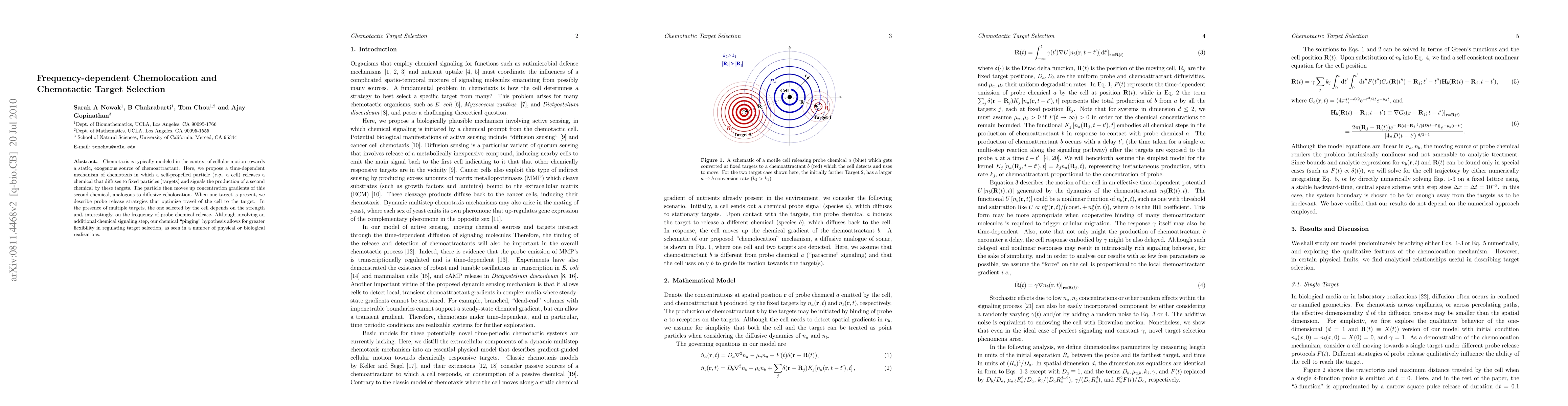Chemotaxis is typically modeled in the context of cellular motion towards a static, exogenous source of chemoattractant. Here, we propose a time-dependent mechanism of chemotaxis in which a self-propelled particle ({\it e.g.}, a cell) releases a chemical that diffuses to fixed particles (targets) and signals the production of a second chemical by these targets. The particle then moves up concentration gradients of this second chemical, analogous to diffusive echolocation. When one target is present, we describe probe release strategies that optimize travel of the cell to the target. In the presence of multiple targets, the one selected by the cell depends on the strength and, interestingly, on the frequency of probe chemical release. Although involving an additional chemical signaling step, our chemical ``pinging'' hypothesis allows for greater flexibility in regulating target selection, as seen in a number of physical or biological realizations.