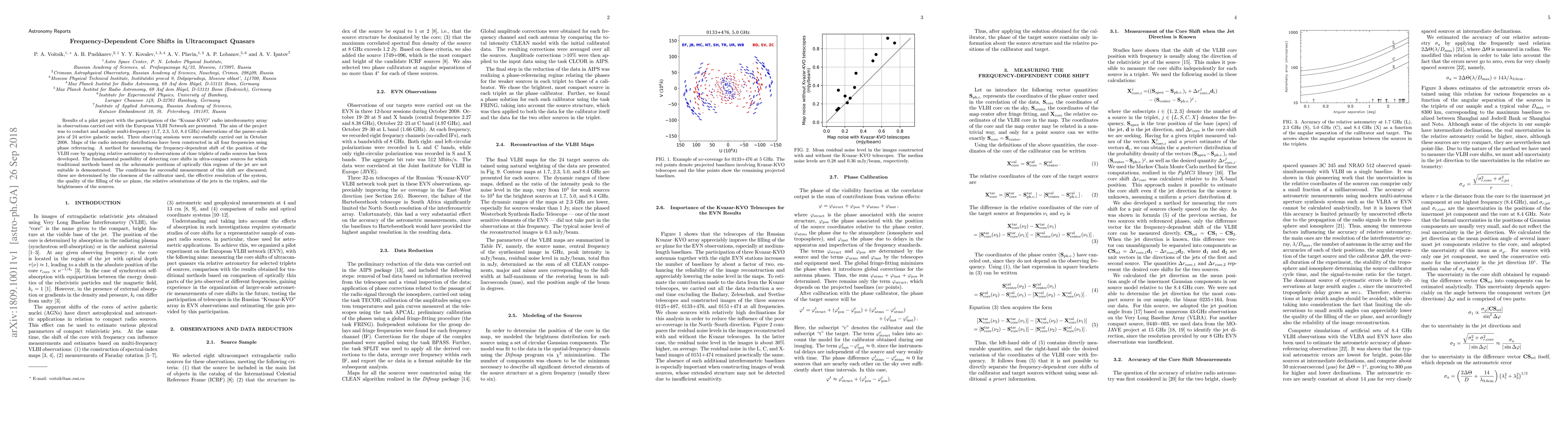 Results of a pilot project with the participation of the "Kvazar-KVO" radio interferometry array in observations carried out with the European VLBI Network are presented. The aim of the project was to conduct and analyze multi-frequency (1.7, 2.3, 5.0, 8.4 GHz) observations of the parsec-scale jets of 24 active galactic nuclei. Three observing sessions were successfully carried out in October 2008. Maps of the radio intensity distributions have been constructed in all four frequencies using phase referencing. A method for measuring the frequency-dependent shift of the position of the VLBI core by applying relative astrometry to observations of close triplets of radio sources has been developed. The fundamental possibility of detecting core shifts in ultra-compact sources for which traditional methods based on the achromatic positions of optically thin regions of the jet are not suitable is demonstrated. The conditions for successful measurement of this shift are discussed; these are determined by the closeness of the calibrator used, the effective resolution of the system, the quality of the filling of the $uv$ plane, the relative orientations of the jets in the triplets, and the brightnesses of the sources.