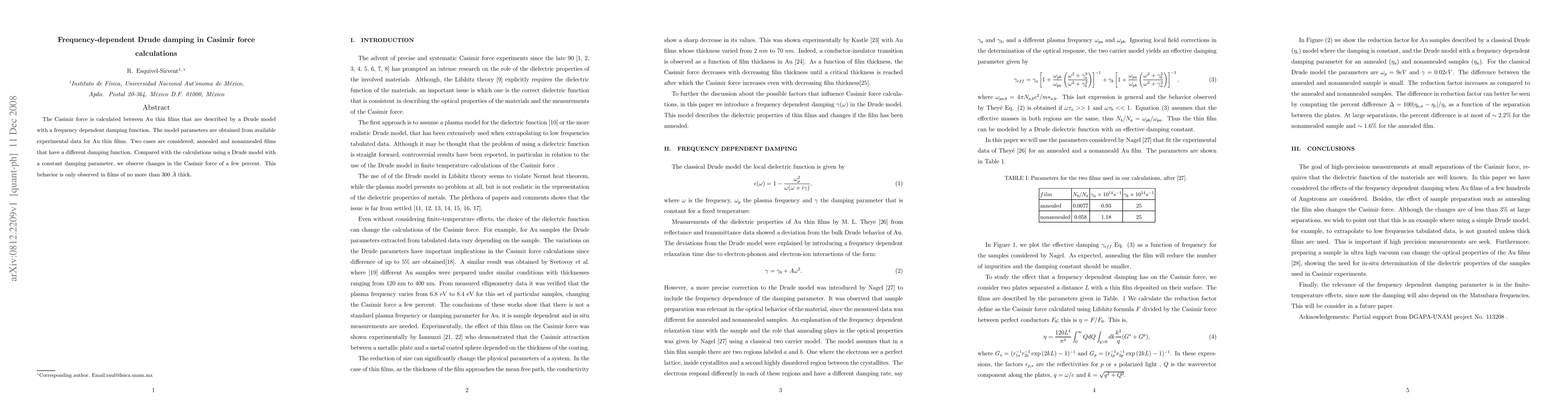 This study calculates the Casimir force between Au thin films using a Drude model with a frequency-dependent damping function, revealing changes in force of a few percent compared to a constant damping model. The effect is significant only in films less than 300 Å thick.