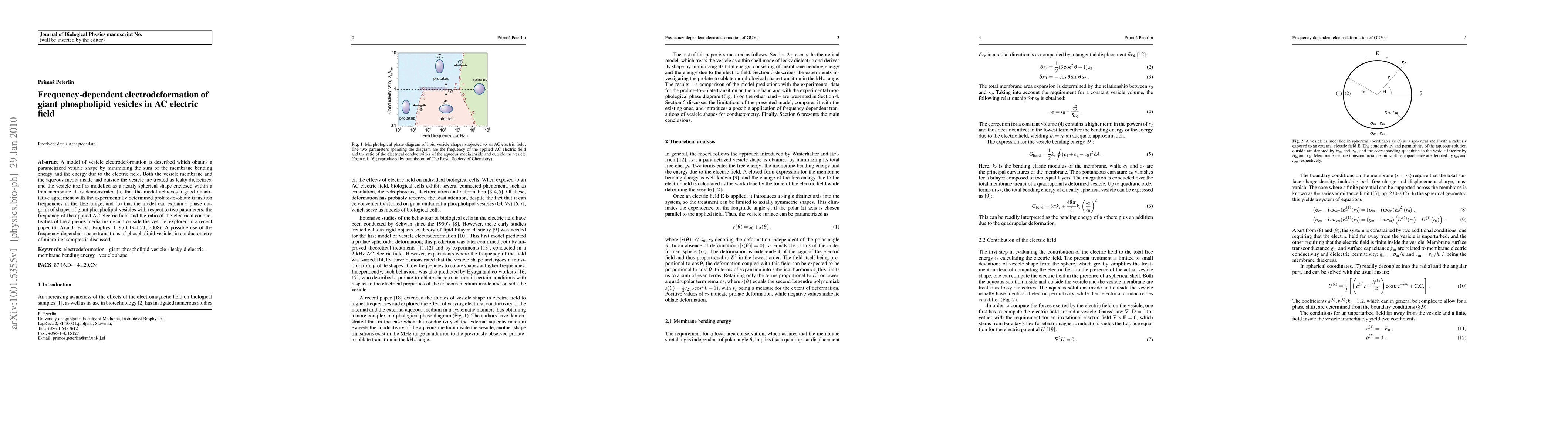 This paper models the electrodeformation of giant phospholipid vesicles under AC electric fields, achieving agreement with experimental transition frequencies in the kHz range. It explains the phase diagram of vesicle shapes based on AC frequency and conductivity ratios, suggesting potential applications in microliter sample conductometry.